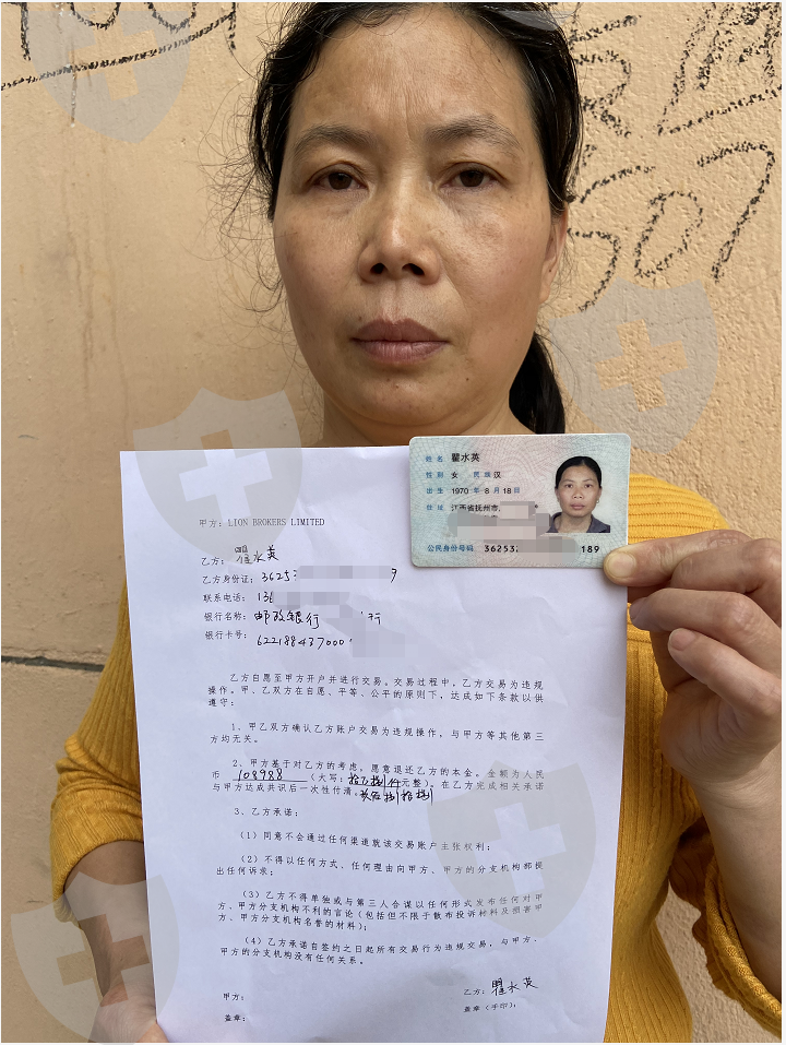 本人瞿水英 身份证号 36253219********89 在狮子金融注册国际期货账户交易 账户 2001626 (现已经不能登入) 3.23号 共计入金 14300美元 手机端 APP 委托挂单交易和手动平仓持仓时间都在1个小时至3个小时之间 交易所说我本人延迟交易 本人承担风险交易盈亏自负原则 盈利共计73159万美元后盈利提现均失败 不让出金。要回本金逼迫签署单方面协议要求放弃盈利否则不给本金 封了账号 后台私自删除交易委托记录 说我延迟交易 违规交易,本人均以狮子手机交易软件下单委托手动平仓