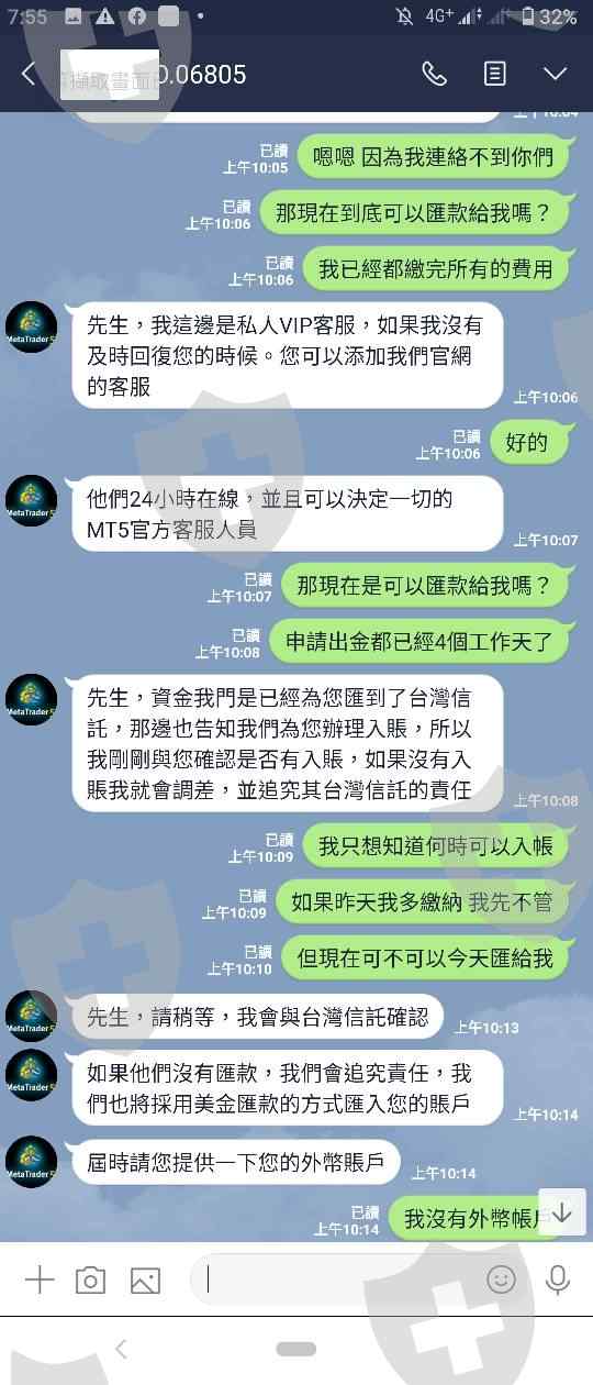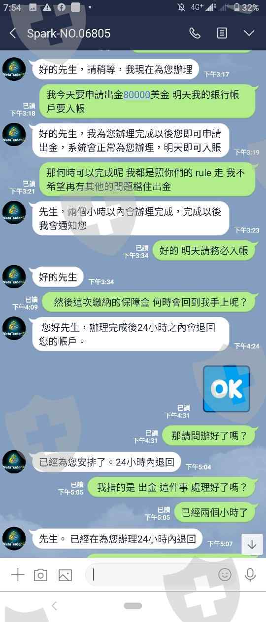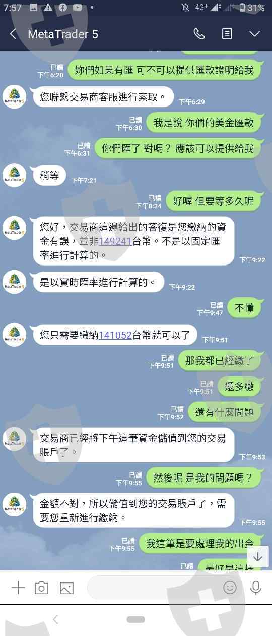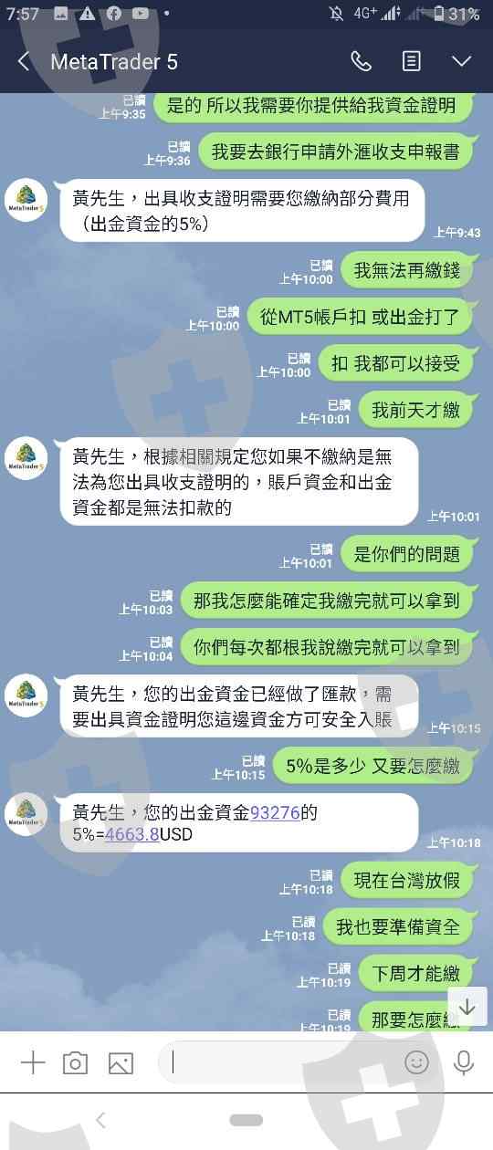 無法出金 用各種理由要求客戶繳保障金 都按照他們所謂的 rule 完成所有程序 一直不能出金 然後用各式理由 要求繳納資金 還是不給出金 花了一個月 連1000都出不了金 直接沒收所有的入金 前前後後都已經匯入100000本金