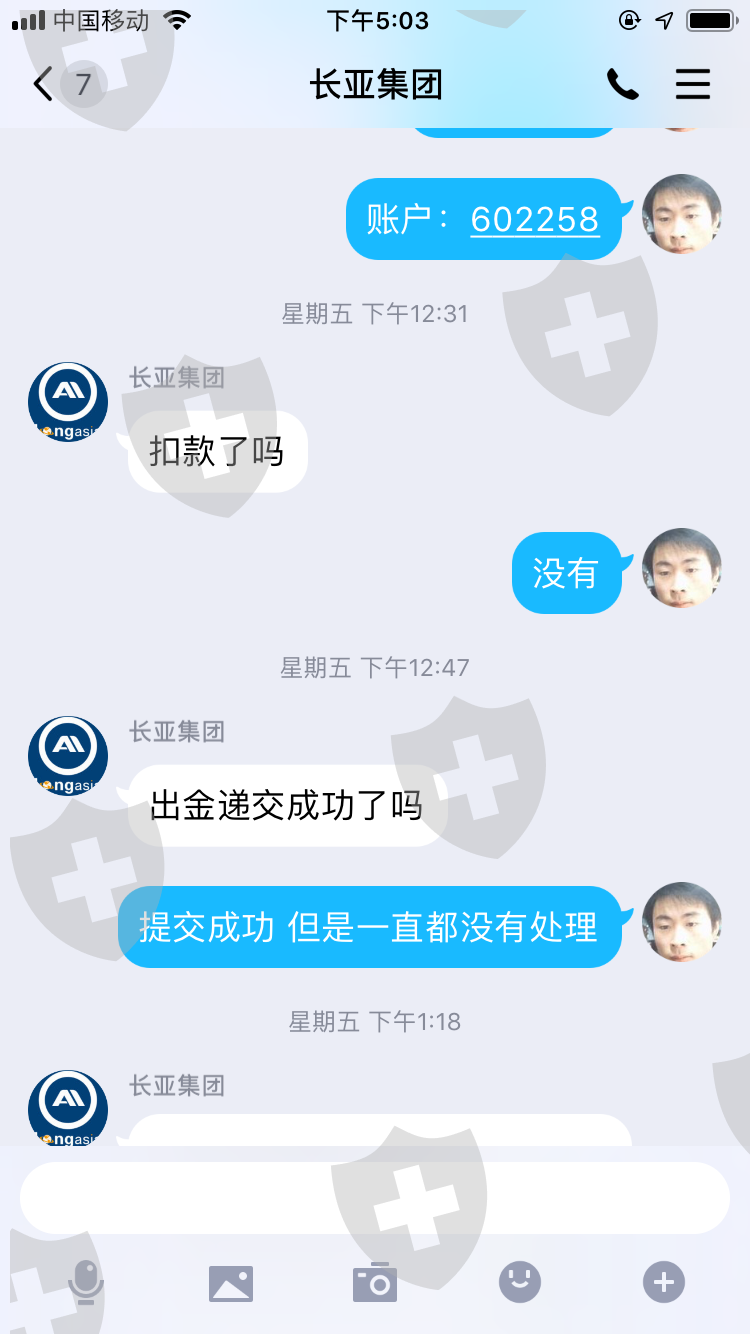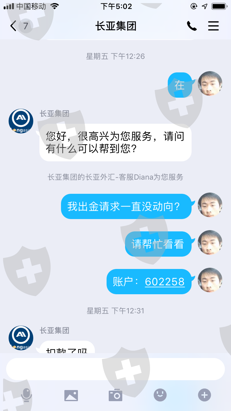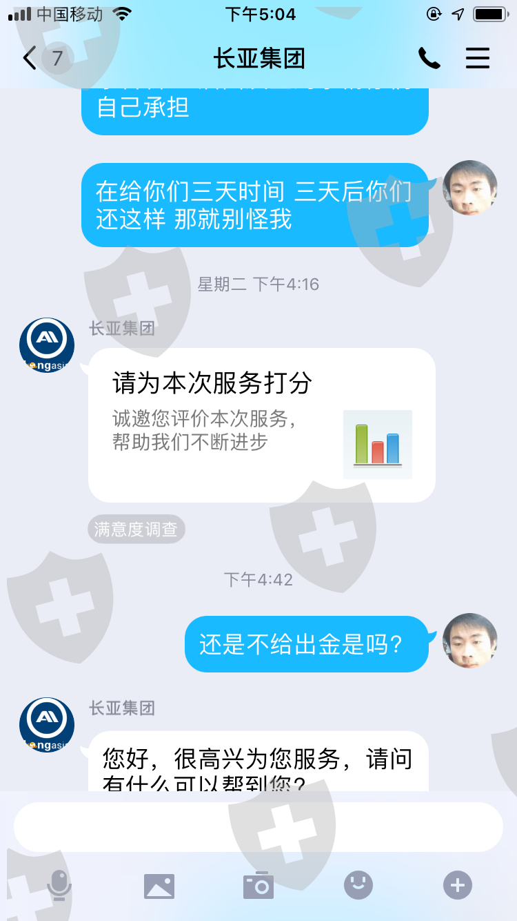 2020年3月20号我从长亚出金32.7美金(从始至今我已经入金4000多美金)一直到今天2020年4月9日依然给我的回复是:耐心等待 这敷衍的话。今天我总算明白这家公司的黑心,我看我那一点点的几十美金是回不到自己腰包了。但是我必须让投资者都知道这家长亚集团公司是多么的无赖,希望投资者们以后千万不要被这家公司给骗了。我倒霉我亏了我认了,谢谢大家