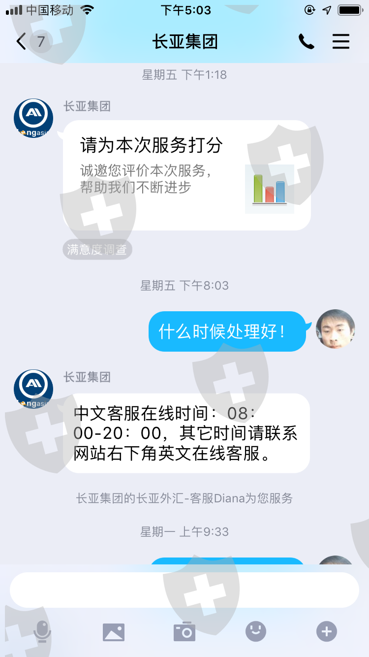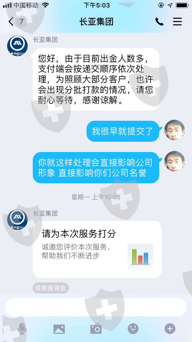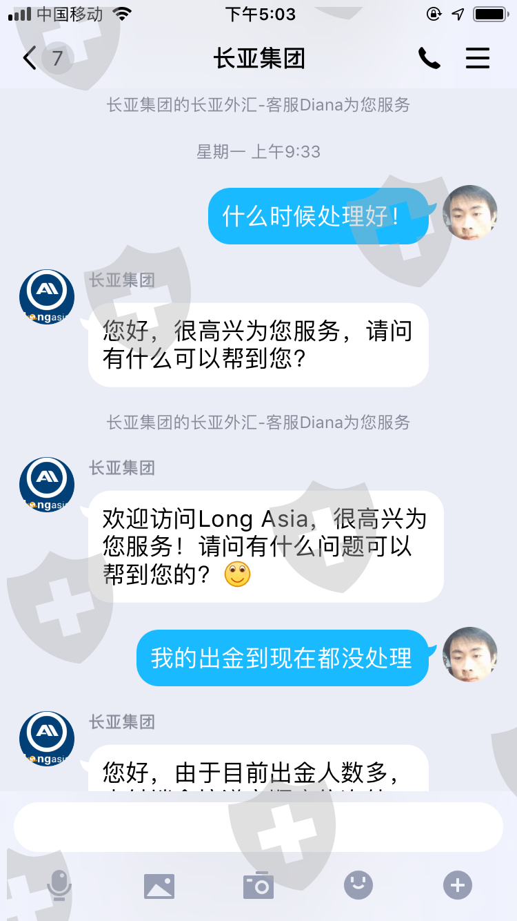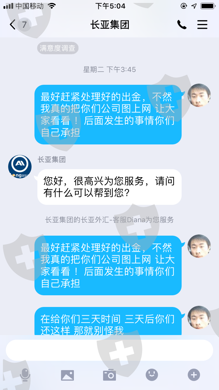 2020年3月20号我从长亚出金32.7美金(从始至今我已经入金4000多美金)一直到今天2020年4月9日依然给我的回复是:耐心等待 这敷衍的话。今天我总算明白这家公司的黑心,我看我那一点点的几十美金是回不到自己腰包了。但是我必须让投资者都知道这家长亚集团公司是多么的无赖,希望投资者们以后千万不要被这家公司给骗了。我倒霉我亏了我认了,谢谢大家