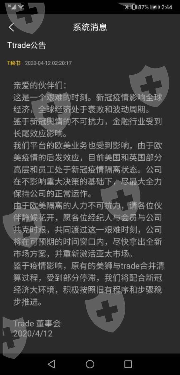 4月12日,美狮TTrade发布公告,借口称由于疫情原因导致美国英国区业务受影响,不给会员出金,满满的借口。。