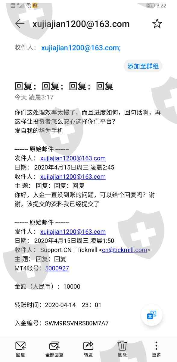 联系邮箱回复什么都没有,就刚开始一句。后来怎么咨询都只是回复,但没有内容,客服不知道怎么想的,而且联系渠道太单一了,只有邮箱,想回复就回复,入金几个小时不到账,导致保证金不够爆仓。
