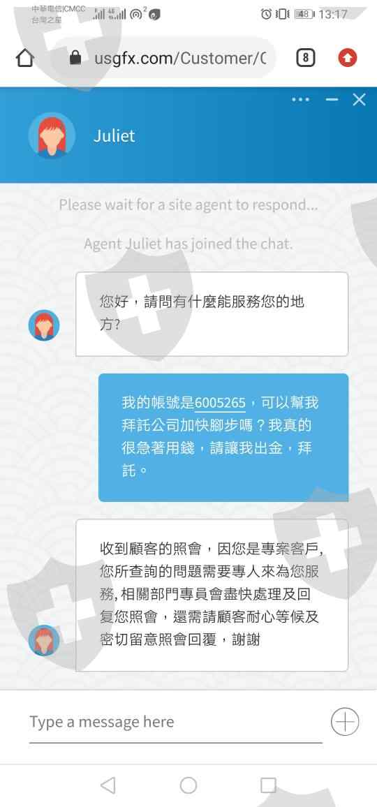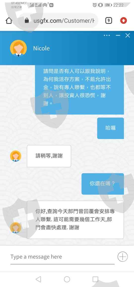 Usgfx不提供出金,一直拖延時間,客服說專人處理,完全沒有消息