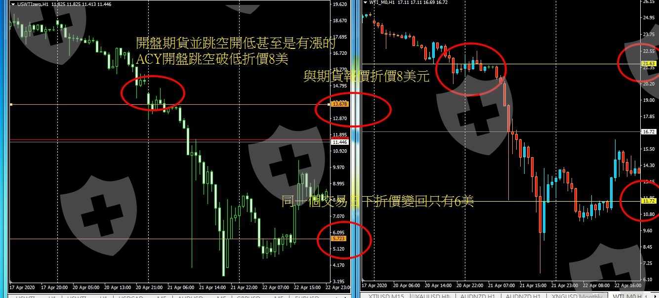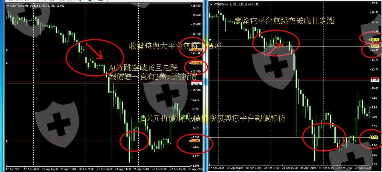 4/20前一直持有原油部位,acy報價也與其它平台無太大差異,當然非一致4/21開盤全市場都沒跳空開低,期貨與其它平台報價還走漲,ACY卻是報價跳空破底,且一直都與它平台發生2美元折價此前為發覺交易報價有異的緣頭,ACY一直推拖每間券商報價加權計算基礎不同,故報價有差異是正常的,個人覺得不合理的點在市場動盪都是一致,4/20前ACY與它平台也沒有很大的報價差異,為何4/21一開盤直接少了2美元,原油報價差了2美元,而且一直都維持這樣的折價,絕對與點差或滑價無關4/21開盤ACY報價與期貨報價折價約8美元,同一天的亞洲下午報價突然又恢復變折價6美元cfd的報價怎樣的計算基礎,可以在一根k棒的時間下又多出了2美元?難道ACY的CFD報價也可以和期貨報價變動有這麼大的落差?那它的報價公允性何在?與平台溝通過程,客服只是一直回答每間平台銀行報價結構不同,故報價會有差異,會有差異我當然能夠理解,但我不能理解是為什麼一下可以折2美一下又差不多?cfd的報價,期貨價格絕對是一個很重要的參考價,又是為何可以一 下折價8美,下一根k報又變折價6美?厚黑一點的想法是大多數客戶都持有原油多單,平台報價直接跳空少2美,讓大部份客戶都爆倉午盤原油爆趺,可能很多客戶都去追空,直接又把這2美元補回去,讓作空客戶損失2美元......不論交易商或銀行端對我所質疑的報價都無法給個合理解釋今天報價沒問題的情況,客戶對其倉位與價格都有決定減倉平倉或轉空的權利,但突然差了2美元,客戶要做什麼交易決定都失了真,並且未來會更難去歸責