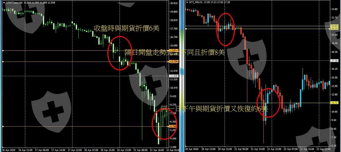 如圖4/20前石油商品與6月期貨走勢報價走勢相近 4/21報價異常開盤不但破底走低,而瞬間折價8美 同一日下午熔斷後又恢復約6美折價 交易商任意變動報價,致我權益受損,請求依報價失常前最有利客戶狀態恢復帳戶應有價值