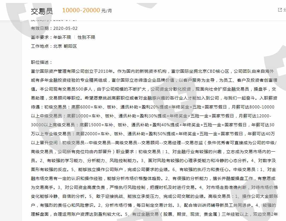 富尔国际 富尔华融 富尔华兴,这类公司都是康德资本这家外汇平台的壳子。打着招聘的名义让你先培训后交钱入平台复考核,视你交钱多少定你的级制别3000美元是初级,10000美元是高级,你在平台是赚不到钱的,但他们会通过你在平台的交易产生的费用和亏损来赚钱, 你以为是在为他们工作,实际上你是被当猪宰