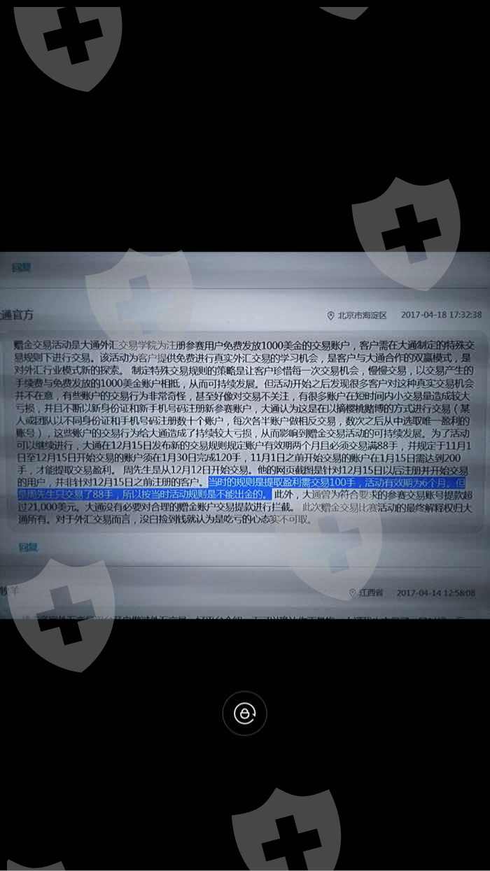 改规则顺序最后的出金规则是每周无交易才取消资格,只有那一张带有每周交易不足8手取消资格,每周交易不超过10手是和那个姓周的截图一样那张图,我发的右下角带有日期是2016.12.16日,后来你们官方回复也说了那张图是针对12月15日之后注册的用户,说他的交易开始日期是12月12日,当时规则就是我发的带有100手那张截图,12月7号规则你们大通金融博客都有,在