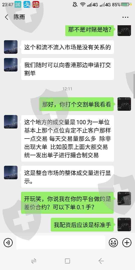 对赌盘,单子并不进入市场交易,业务经理存在欺诈行为,第一张是信管家,第二张是文华财经,第三张欺诈软件,第四张软件显示的成交时间,第五张与业务经理聊天记录,告知我打交割单,就再也没有回信,他也根本打不出来。