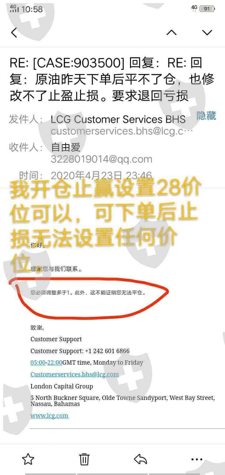 我在lcg平台20日晚上22点钟开户成功入金14121元,23点钟开第一个单子原油10.8多单,下单后我马上设置了一个止盈28价位,后来我想再设置一个止损在10价位,可手机一直设置不了止损,也平不了仓,万般无奈下我录了当时一个视频无法操作设置止损和平仓。同是在的单子没有爆仓前发微信给LCG客服经理多次,说原油单子无法操作止损和无法操作平仓,没有回复微信。