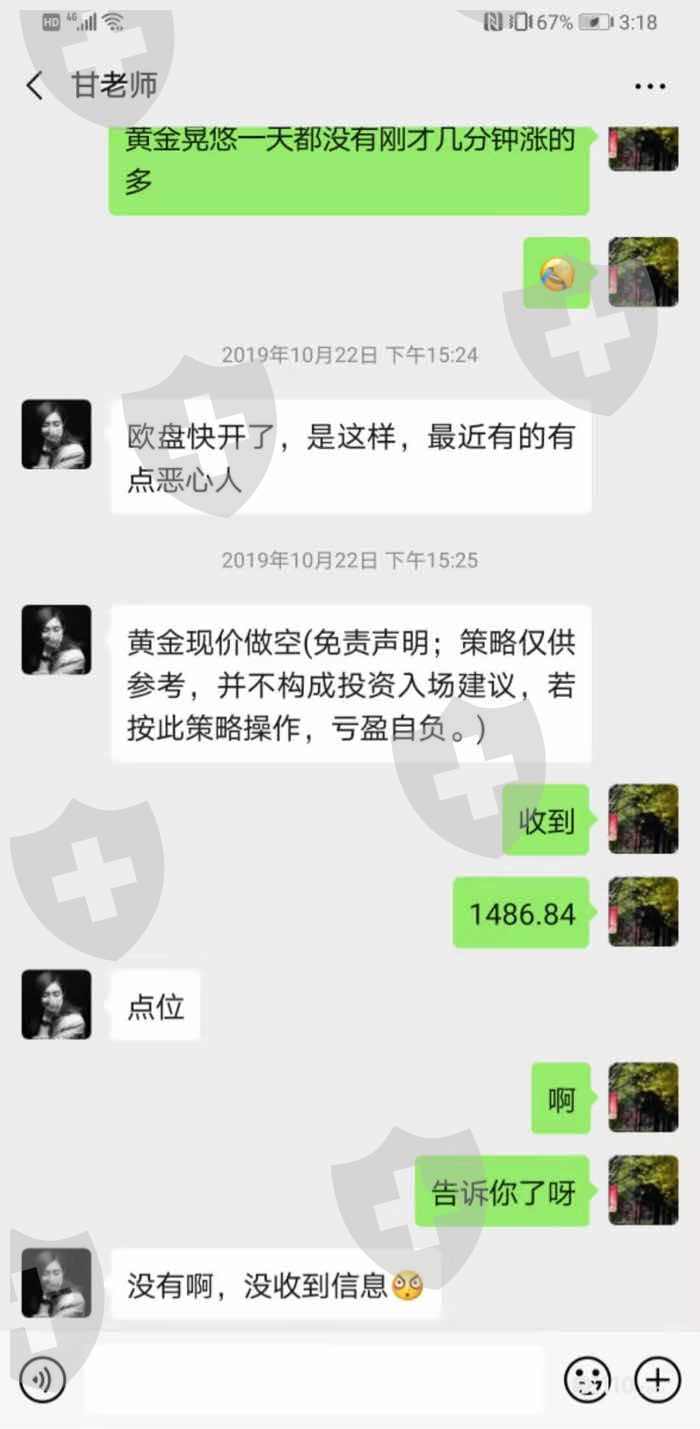 去年10月,我是在微博关注到金融分析师甘老师的微博(现已被举报封号),因为她在微博上经常会发帖分析黄金原油等产品行情,给人感觉十分专业,于是找到他。