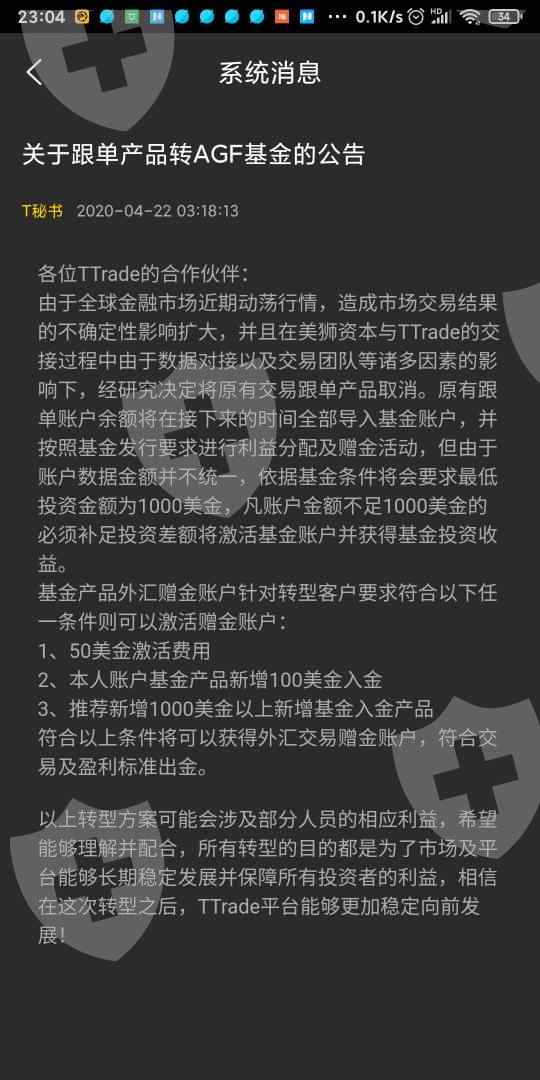 第二条:升级系统期间说补偿本金12.5%的收益作为锁仓赔偿,到今天了还不给,耍猴呢?被迫暂停跟单交易后,顺杆爬,以国际局势动荡,永久取消跟单业务,强迫客户跟单本金全部购买他们的AGF基金。对于不是直接购买基金的我们,给予不公平对待,要充值100美金,才能激活等额本金的自主交易赠金账户,想钱想疯了!由于他们操盘手造成了巨额亏损,公司不仅不赔偿,反而要求本金低于1000美金的会员充值到1000美金以上才能享有基金的收益和一年后提取本金的资格。傻逼都知道12.5%没有了 跟单亏损不补偿了,为啥呢?继续圈钱!骗我们入金呗!