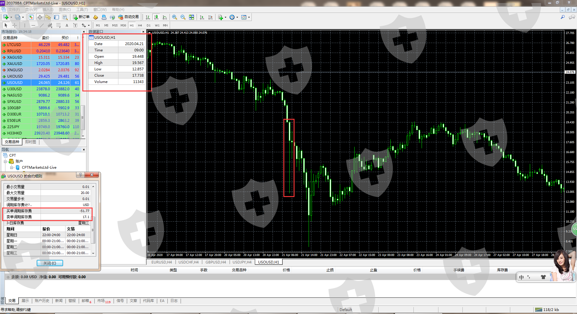 欧福市场恶意压低现货原油报价,拉爆我的账户。作为对比我选择了GKFX和CPT这两家作为截图证据,大家如果不信,大可以去查看市面上所有的有现货原油的平台,基本报价和K线都跟GKFX和CPT差不多的,这两家平台目前在国内也算比较有名气。 先看当时北京时间4月21日下午五点欧福的小时图,大家看欧福的最低价是不是比所有的平台都来的早。 前面提到了欧福的解释是报价商不同 ,计算方法不同,导致的。 看完这么多图,不难发现,欧福的K线图其实之前很长时间是和市面的其他平台一致的,也正说明了哪怕报价商不一样,他们的报价呈现出来的K线是一样的,这也说明其实不同的报价商计算现货原油的报价的方式大体是类似的,如果偏差很大,价格会直接反映在K线,也就不会有如此相似的K线呈现了。这表明,无论采用哪种计算方法,现货原油产品在市场上实际上只有一种K线图,一个产品不可能有两种K线,否则如何通过K线分析价格走势?到现在我想我的证据已经足够打脸欧福的解释了吧。他们是如何做到前面那么长的时间和其他平台保持K线一致,而后K线偏差如此之大。单单用报价商不同,计算方式不同来解释是不是前后矛盾?欧福并没有邮件通知客户说更换过报价商或者报价商计算方式不同会导致现货原油价格不同。到这里我不得不怀疑欧福有恶意操纵价格嫌疑。