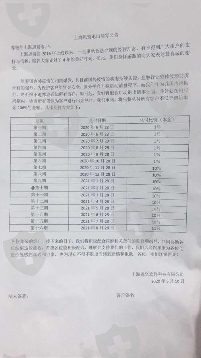 上海恩贤迈达斯平台无法正常出金 3月7号到期 不给出金 现在宣布退出16期分期返还 等于跑路