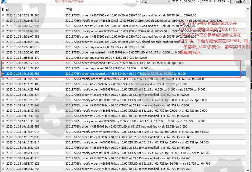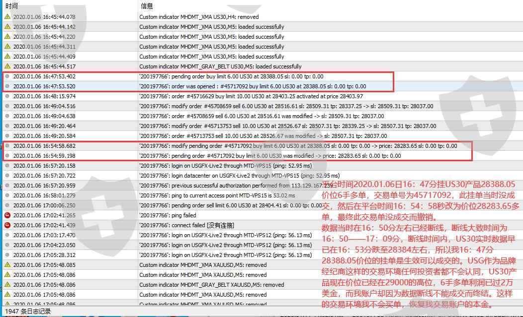 USG平台经常性断线,卡盘,滑点,导致200197766账户该有的单子没成交,已成交的单子成交价与建仓价不符,严重干预账户利益,现将所收集的部分证据一一列举: