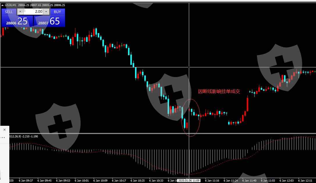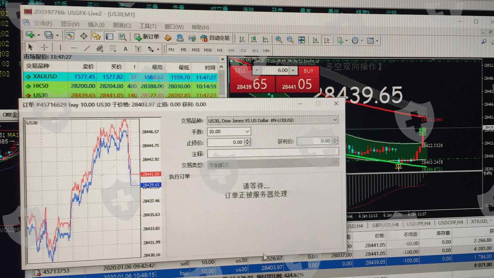 平台时间2020.01.06日16:47:53秒挂US30产品28388.05价位6手多单,交易单号为45717092,此挂单没成交,然后在平台时间16:54:58秒改为28283.65多单,最终此挂单没成交而撤销,数据当时在16:50分左右已经断线,断线大致时间为16:50分——17:09分,断线时间内,US30实时数据早已在16:53分跌至28384左右,所以我16:47分28388.05价位的挂单是生效可以成交的,US30现在价位已超29000的高位,6手多单利润已达到2万多美金,而200197766账户却因为数据断线不能成交而终结,弥补45717092此交易单的利润。