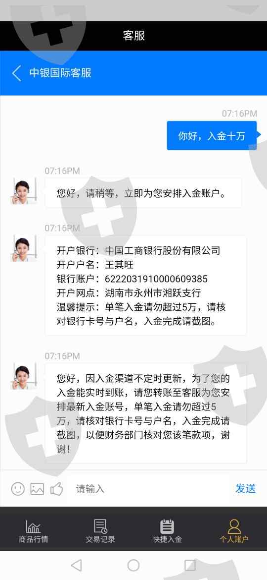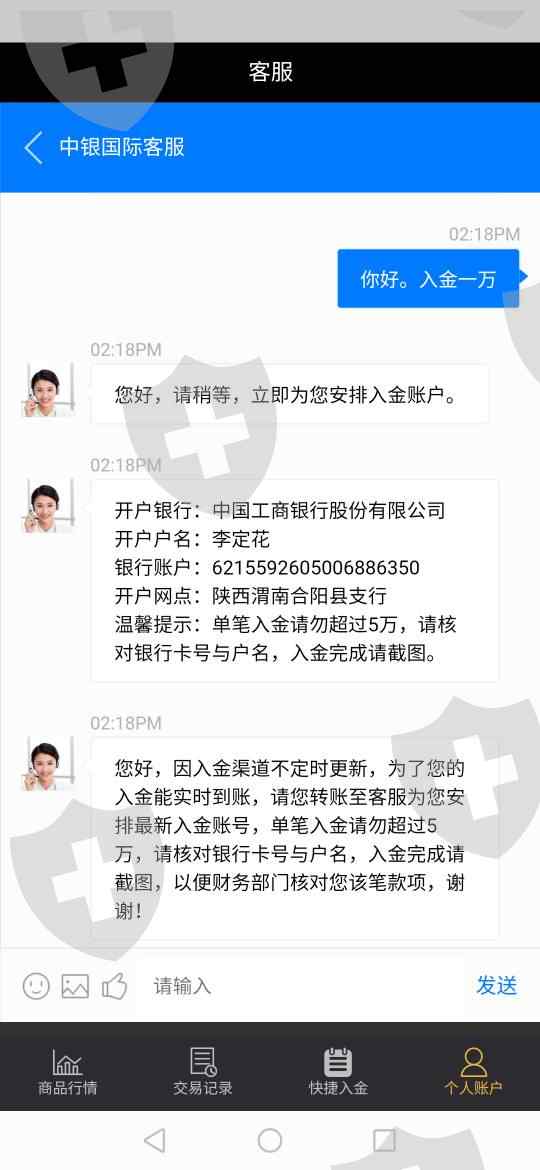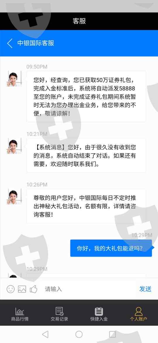 一个没见过面的业内朋友推荐做中银国际。当然没有怀疑。看到APP图标以为是中国银行的外汇交易平台。开始几单提现比较顺利,但是21号因为朋友帮我凑齐十万入金,客服说达到申请大礼包的资格。我在这位朋友的怂恿下申请了一个50万送58888元的证券礼包。交易完毕申请出金竟然被拒绝了。我问客服想退掉,因为申请的时候并没有说明白需要五天内必须入金50万标准,并且达不到入金标准就每天罚款2.5万作为违约金,还要上报中国人民银行征信黑名单。我才担心可能真的遇到黑平台,或者是假冒中银国际的黑平台。中银国际有责任和义务尽快帮我们这些上当受骗的投资者挽回损失。并且需要清理所有假冒的伪平台,减少对官方平台的不利影响。
