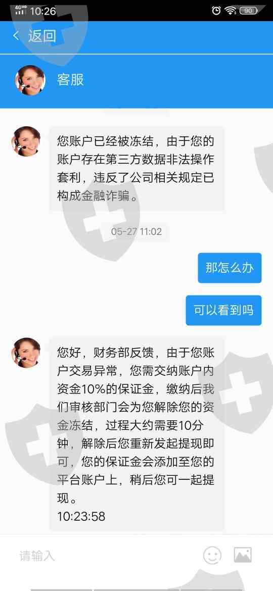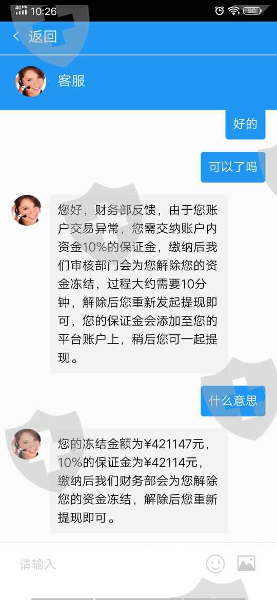 5月21号在IG平台前后充值了6万,现在金额421147元,5月26号提现,5月27号已被冻结,说系统检测你的账号异常,您需交纳账户内资金10%的保证金,缴纳后我们审核部门会为您解除您的资金冻结。您的冻结金额为¥421147元,10%的保证金为¥42114元,缴纳后我们财务部会为您解除您的资金冻结,解除后您重新提现即可。