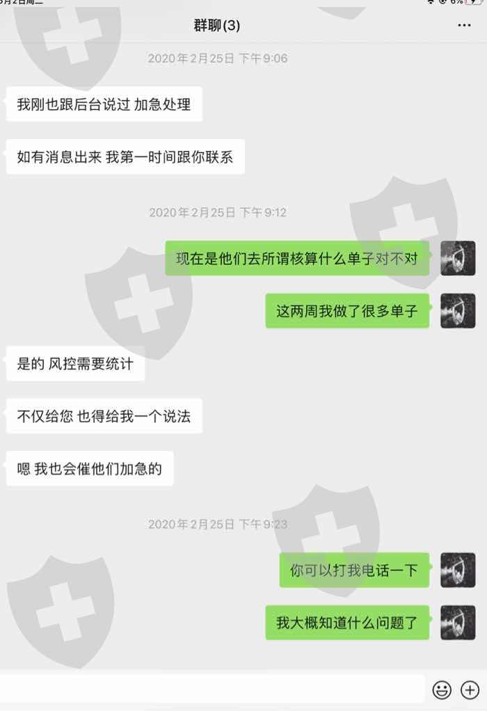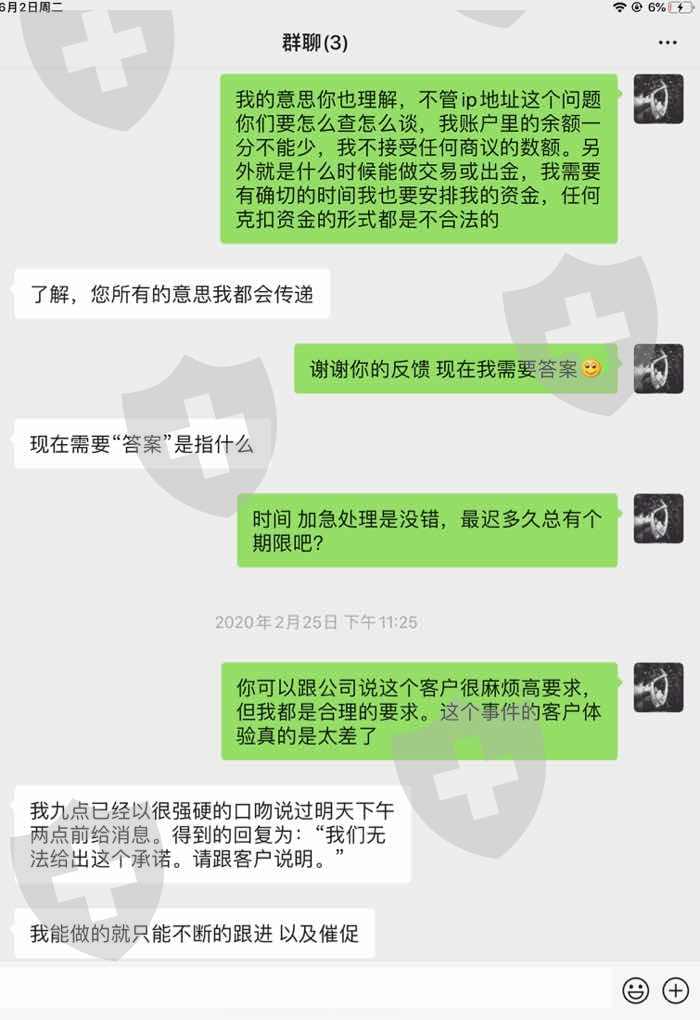 2020年2月24号申请出金2200美金,当晚发现平台登录不上或经常断线,联系客服无果只能自己使用不同运营商和不同设备尝试,到25号凌晨2-3点左右算是恢复正常。25号上午7点多继续正常交易,至25号晚上7点20分左右,当时账户余额还有6万5千左右,净值6万6千左右。