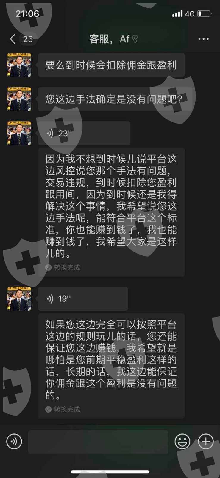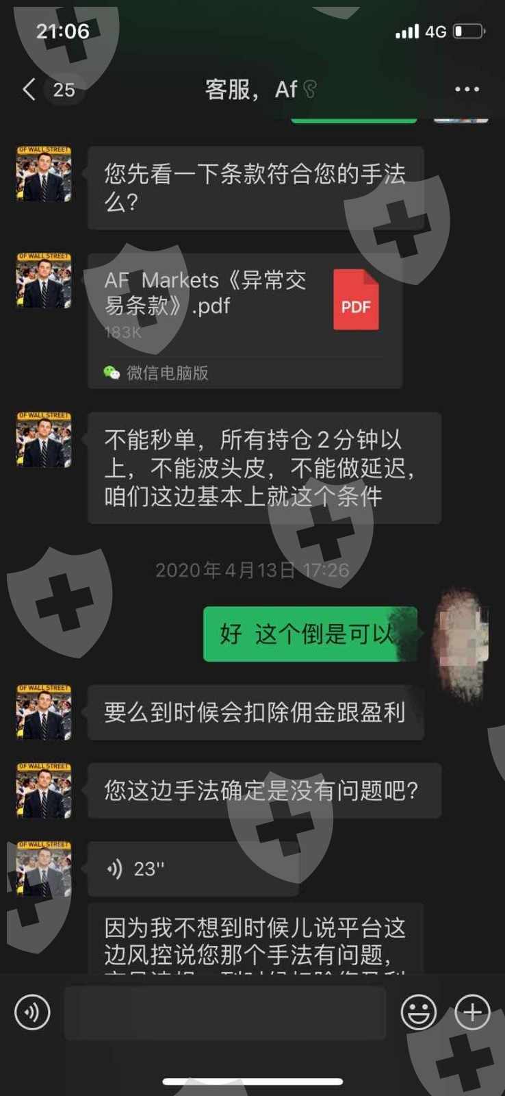 本人通过宣传了解到AF这个外汇平台!平台宣传各种资金安全!结果入金后,迟迟不到客户经理解释入金丢单!就是入金后查找不到相关银联信息,我这边提供了记录那边还是查找不到,最终凌晨才完成入金。之后略有亏损几十美金后因生活需要资金所以出金,亏损账户顺利出金。随后因资金宽裕又恰逢想在3日加元数据时进场。于6月3日入金。盈利1400余美金,本是很开心一件事,结果出金受阻!平台客服回应只可以出本金!说当时报价商价格没有接到单子,说抹除那段时间的交易。但据我了解真正亏损的数个账户客户并没有得到抹除交易的通知,客户损失了就是损失了!赚钱了就说有问题!只允许亏损不允许赚钱,试想这样的平台是否能开展下去业务?入金前客服各种要求持仓时间与交易手法,但我因被宣传平台可靠性迷惑选择了接受,但真正达到了AF要求的交易后,盈利又各种理由!真是黑到家了!大家远离!