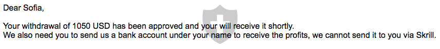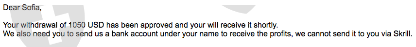 首先,当您打开帐户时,请确保所有文件都经过验证,然后他们会和你说没有客户经理,让你自己进行交易,他们会给你发送电子邮件,但邮件不回复。在您自己进行交易之后,赚钱要求出金,不知道哪里冒出来的账户管理员打给你要求你再发送一个ID和地址证明。行,最初我收到了圣地亚哥·亚科瓦佐(Santiago Yacovazzo)的电话,回答了安全问题以验证我的身份。这次我惊讶的是,他在电话里有点不在状态,多次让我等待,也没问我任何安保问题,我要问的时候又挂我电话。更让我惊讶的是,他在电话里告诉我不要担心,肯定会给我利润出金,声称他们是正规交易商。但是现在钱还是没收到。我发邮件询问出金进度,因为在9点的电话是说没问题的。他拒绝出金还问我要另一张身份证(护照)和居住证明。