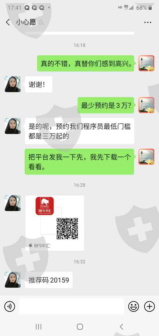 黑平台,这个叫小心愿的团队一切的手段都是为了让你入金。入完金钱就通过他们所谓的后台划走了。为了让你相信你的钱最后亏掉,后台操作员会给你安排一个虚拟的操盘过程,带你操作,最后会以各种原因证明是你自己操作失误导致亏损,这种情况他们公司不负责。最终达到安全脱身目的。如果你与他们纠缠,小心愿和操作员就会立马给你拉黑。昨天他们又上了一个新的平台,老的牛汇(BFS)平台曝光太厉害,放弃不用了。擦亮眼睛吧各位。