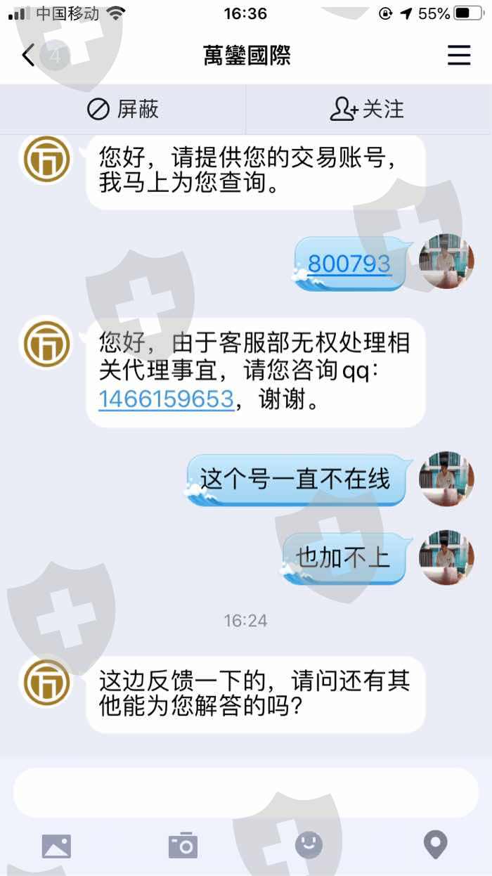 我是万銮国际的代理商,自2019年年初起,我登录万銮国际的账户就显示无效账户,联系客服后,客服说是内部清理长时间不使用的账户,可是,我的账户一直都在用,而且,里面还有一万多美金,账户有资金,凭啥封我,而且,还不给我出金,让联系另外的客服qq,那边也一直加不上,也没有人来处理,官网电话打不通,让联系的qq号也加不上,唯一回消息的官网客服说无权处理,事情就这样拖着一年多了,一直不给处理