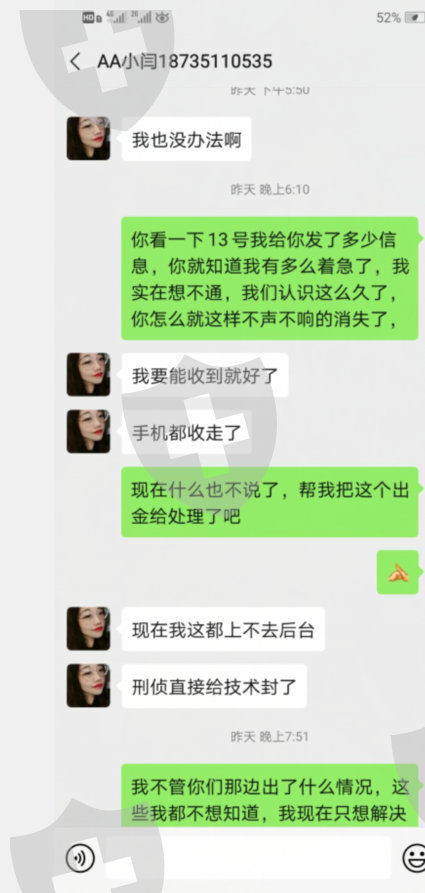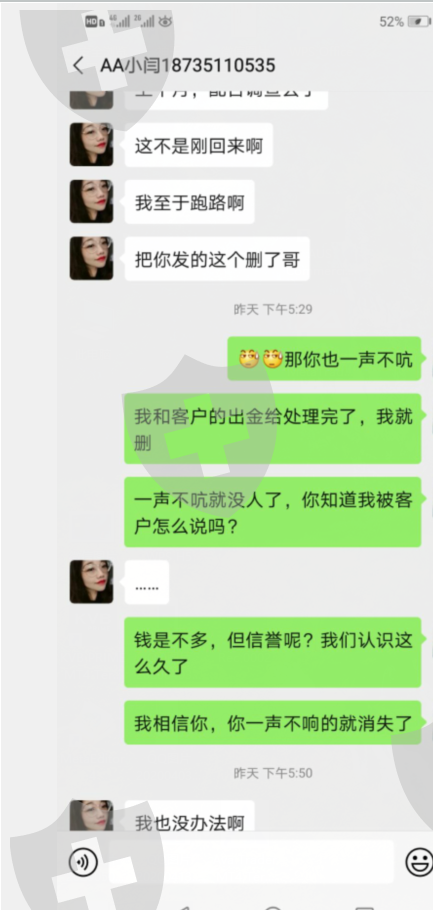 业务员消失了一个多月,因为看到了我发的曝光信息过来找我,让我给删除了,我说把出金问题解决了就给你撤销,结果说的比我这个受害者还委屈,真可笑。一开始找我的时候说的天花乱坠的,资金可以保障,绝对安全,出了事情就这个样子,先是不理你,然后说没办法。一点底线都没。