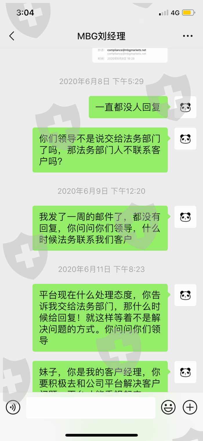 我是MBG平台的代理商,2020年5月份通过客户经理在MBG平台开代理开账户,且所有账号都是客户经理帮我开设的。做了一个月,在5月27日申请出佣金,平台突然驳回出金请求,不予处理,同时业务经理说自己管不了出金的事情,随后MBG平台业务经理就失联了,人间蒸发,后来我各方打听,了解到MBG平台是吃客户头寸的,现在不给我出金,是给业务经理分了头寸。我给平台客服发邮件,客服以我涉嫌违规交易为由要冻结账户。至今一个月过去了佣金账户资金无法出金,我要把这件事曝光出来,以免更多朋友受害,损失惨重。以下聊天记录、微信截图、账户截图、均属实。