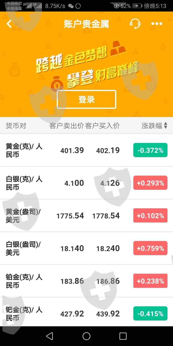 中国银行就是个合法的流氓,和三桶油一样国籍油价涨它跟着涨,国籍油价跌它不跌。我做贵金属黄金交易,国籍盘涨它不涨,国籍盘跌它跟跌