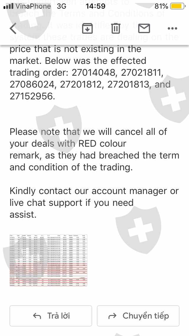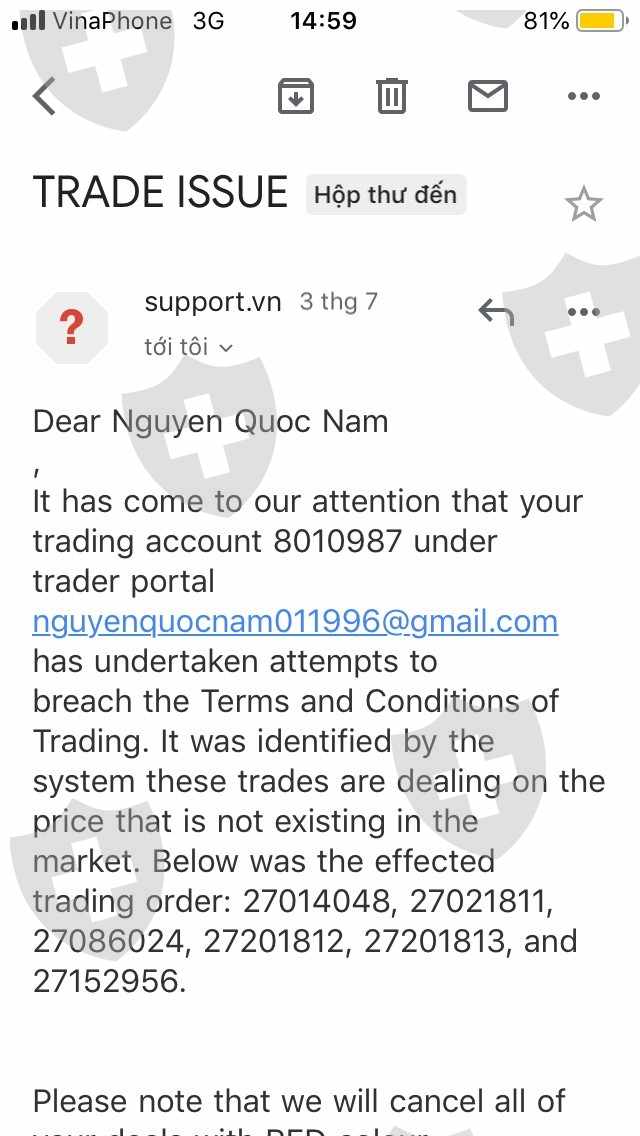 khách hàng lợi nhuận từ mã CNH300 bằng lệnh buy stop và sell stop là 11.000$ nhưng lại không cho rút tiền, kĩ thuật sàn nói là gian lận. Nhưng nếu là gian lận vậy sàn để lệnh BUY STOP và SELL STOP để làm gì rồi khách giao dịch, khi hỏi lại vẫn không có câu trả lời thỏa đáng, đồng thời bị sàn BLOCK tài khoản khi tài khoản đang là 11.000$. Tôi muốn sàn phải hoàn trả tất cả tiền trong tài khoản tôi