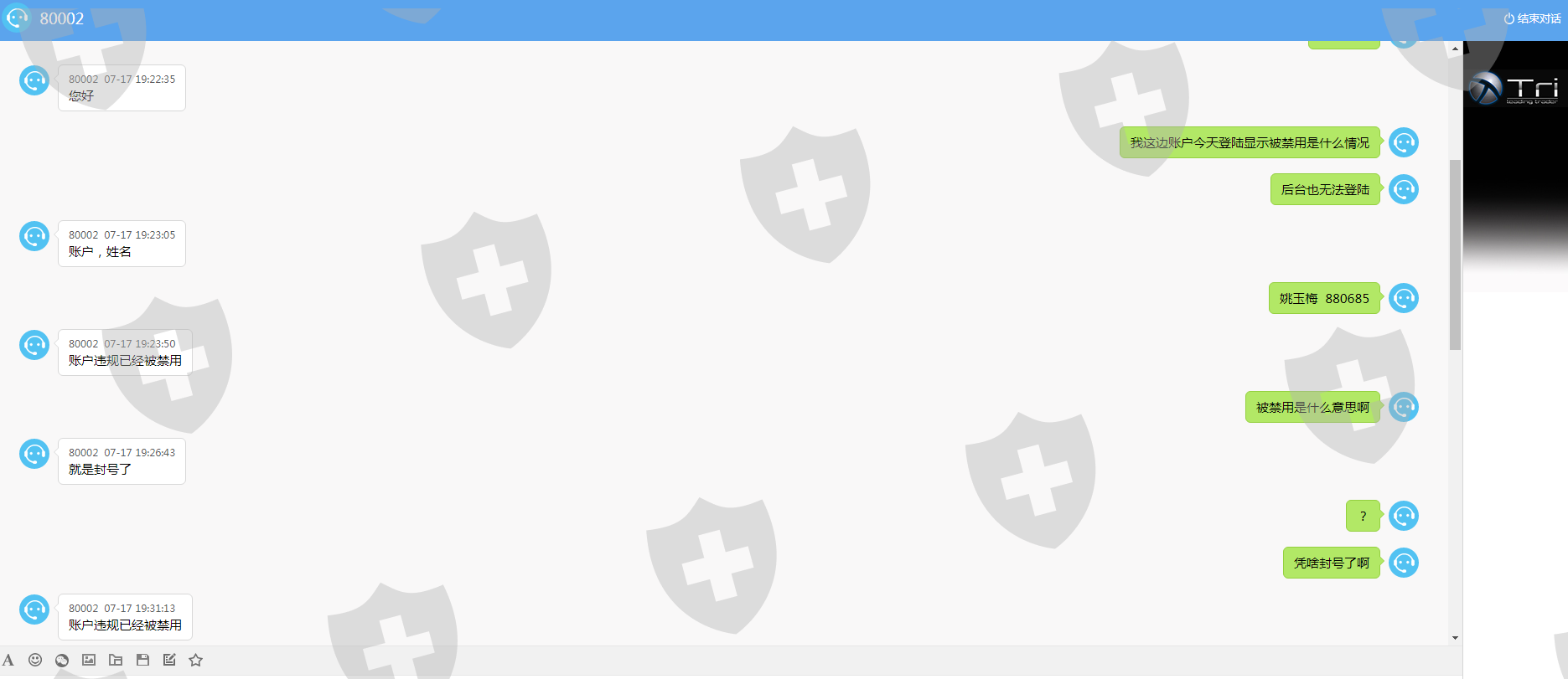 本人五月入金TRI平台后,期间账户有赚有亏,再14号赚钱后平台开始禁用账户,问客服就说封号了,然后就不说话了。本人做单并无任何问题,也没有什么违规,他们也说不出哪里违规就封号。就是赚钱后不想给钱的平台。到现在还是没人处理不给出金!
