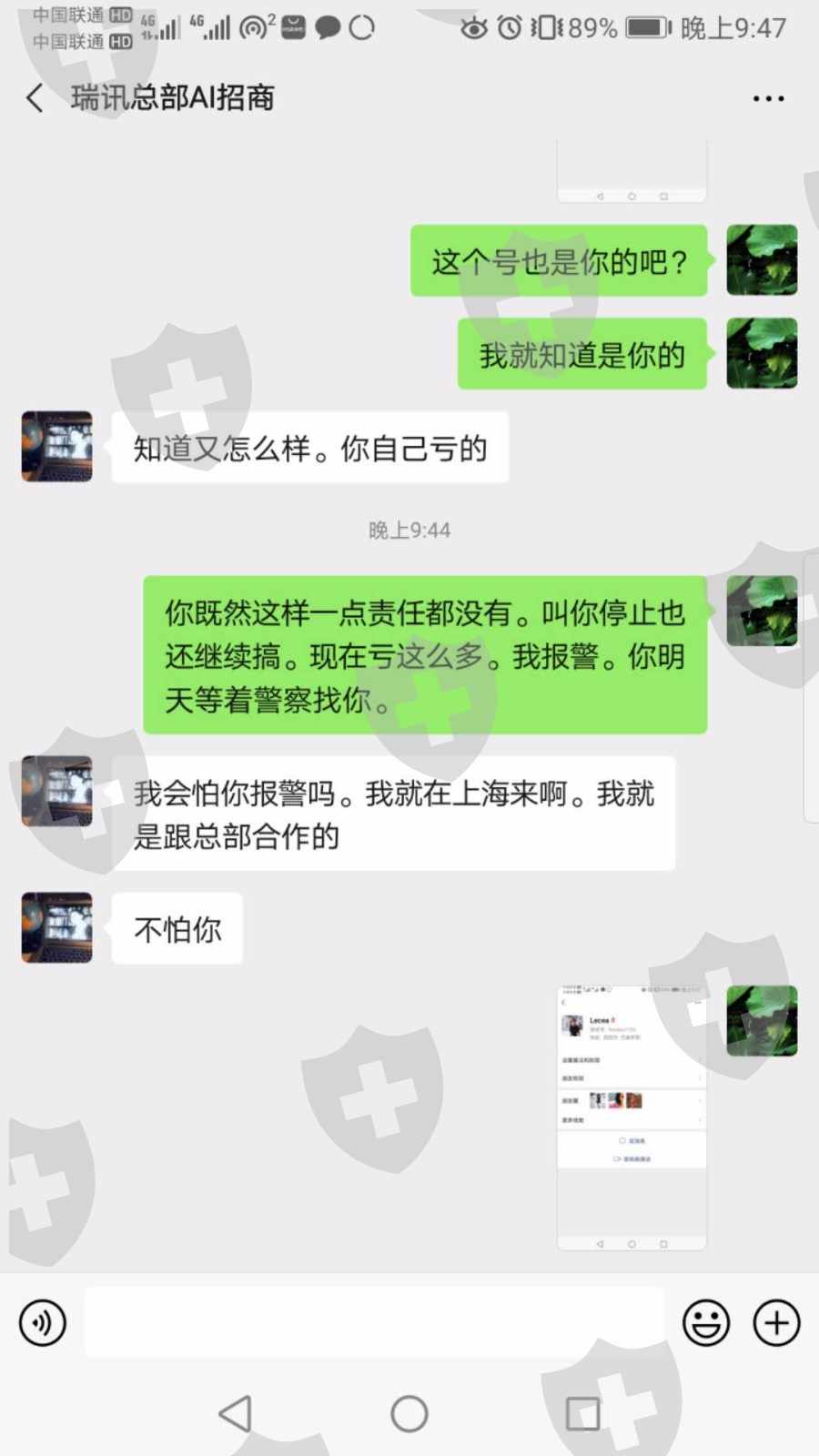 拿着我的账户疯狂交易,结果导致账户亏损严重不赔偿,自己说自己北京开公司,后来说是是上海。是瑞讯平台北京办事处。做人很没有诚信。不知道哪里加了我,结果办事特别不靠谱。导致我亏损很严重。这是我信用卡套得钱,害得我要家破人亡了。