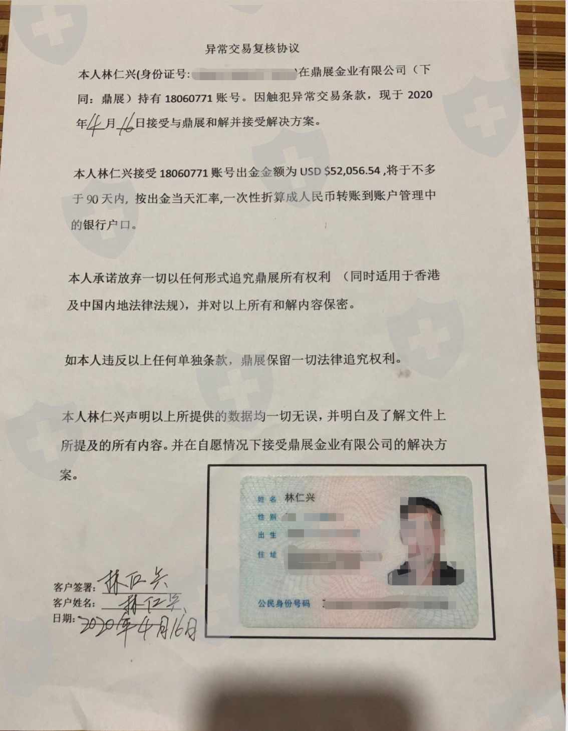 本人林仁兴,持有鼎展金业的账户:18060771,由于疫情的影响,使原本不富裕的家庭雪上加霜,所以贷款了三四十万资金在鼎展金业公司操作,经过了本人的一番神操作之后,本人在鼎展金业公司盈利了六万美金左右,然后本人就想出金六万美金左右,没想到,鼎展公司是个无赖公司,不让我出金,同时也把我的本金扣押在那边,之后又逼我签下那份协议书,这份协议书对我而言,毫无公平意义可言,但是没办法,因为本金业被扣押在鼎展的平台上面,本人只能含着泪去打印那份毫无公平可言的协议书。而后鼎展刻意扣押本金37万90天。截止7月28日为止,现在鼎展金业把本金已经全部汇到我的账户上面来,但是我鼎展金业账户上面还有61667美金,鼎展金业无缘无故把我61667美金在平台上面出金,又没汇到我的银行卡上