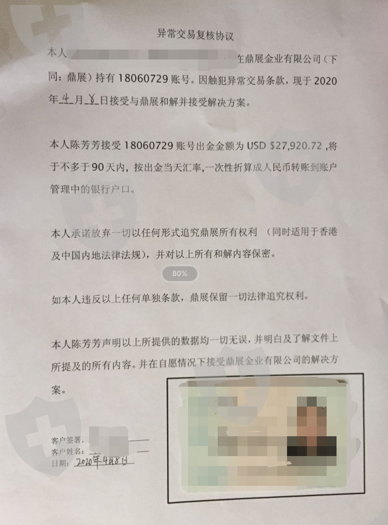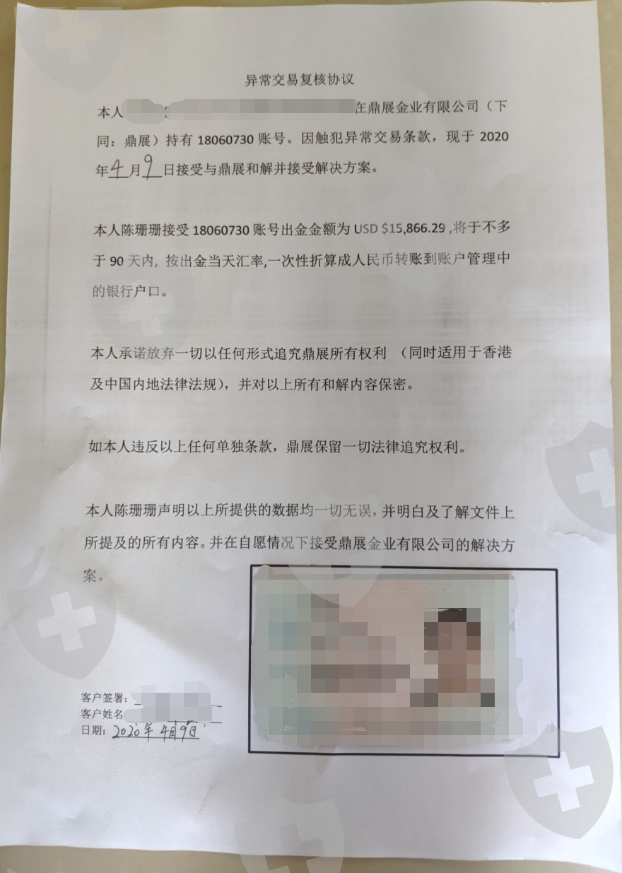 我和我朋友在2019年7月份在鼎展金业进行交易期间一直正常,出入金业正常。而后在2020年3月份开始盈利,鼎展金业就以异常交易关闭我和我朋友的出入金通道,并关闭后台不让交易。而后更是强行要求我们签署协议,扣除所有盈利并按协议要求在90天内退还本金。后协商无果,被逼签署下协议,只能在4月8号和4月9号签署下协议,在2020年7月8号和9号退还了我的本金。因为新冠疫情,鼎展金业有恃无恐,知道我们根本去不了香港投诉维权,期间电联交易热线,客服热线无人接听,咨询客服爱答不理,在7月20号开始客服也没有任何回复。因香港鼎展金业是明星代言,且按页面宣传有地产代理和理财策划,安全运营七八年,还是香港贸易场AA级会员,所以我才会在他们公司进行交易,没想到是这样的黑平台。强制要求扣除所有盈利和返佣,并扣押本金长达三月之久,不给任何回复。