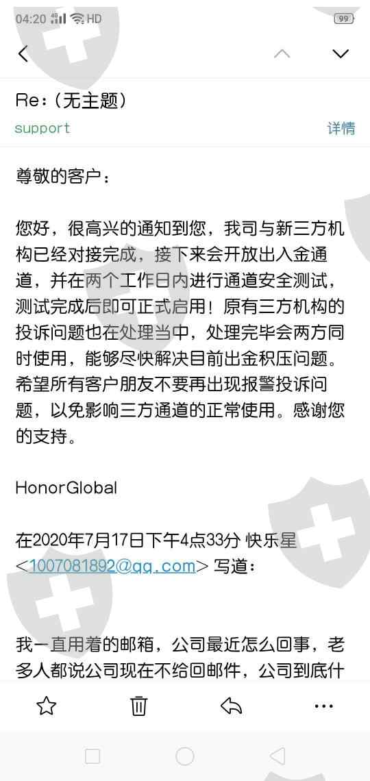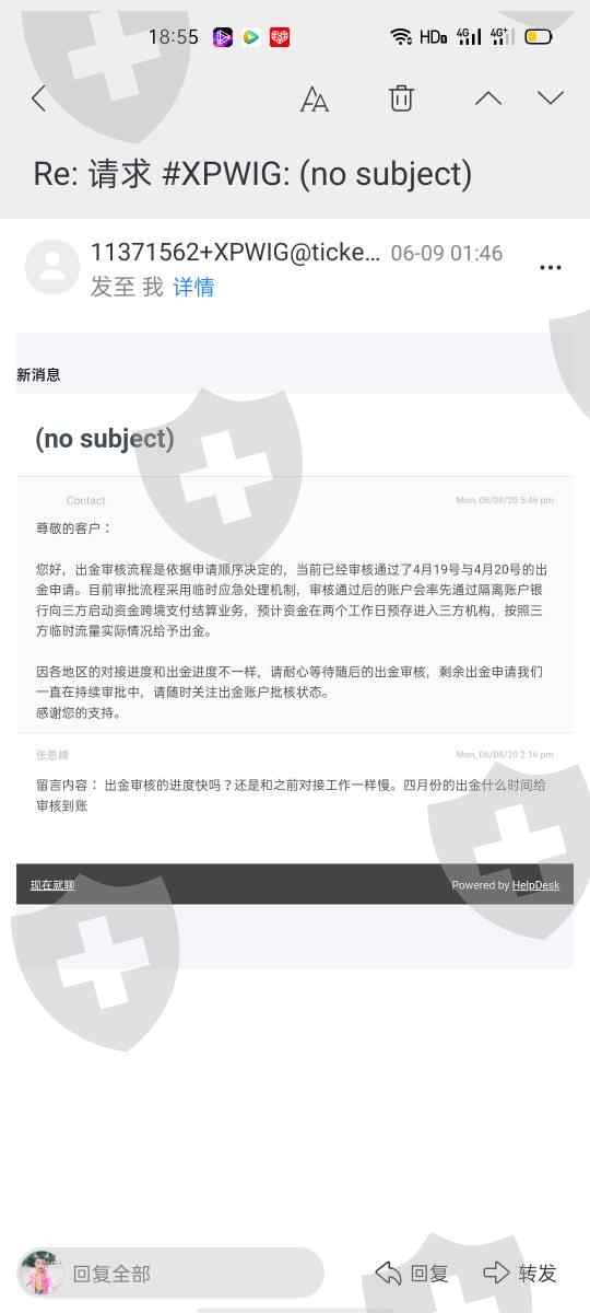 无法出金 从4月19号到八月份一直不给出金,各种理由推托,又直接推到了9月份。这个平台套路太深了,自己里边十多万本金拿不出来。客服发邮件还不让报案,煎熬着急