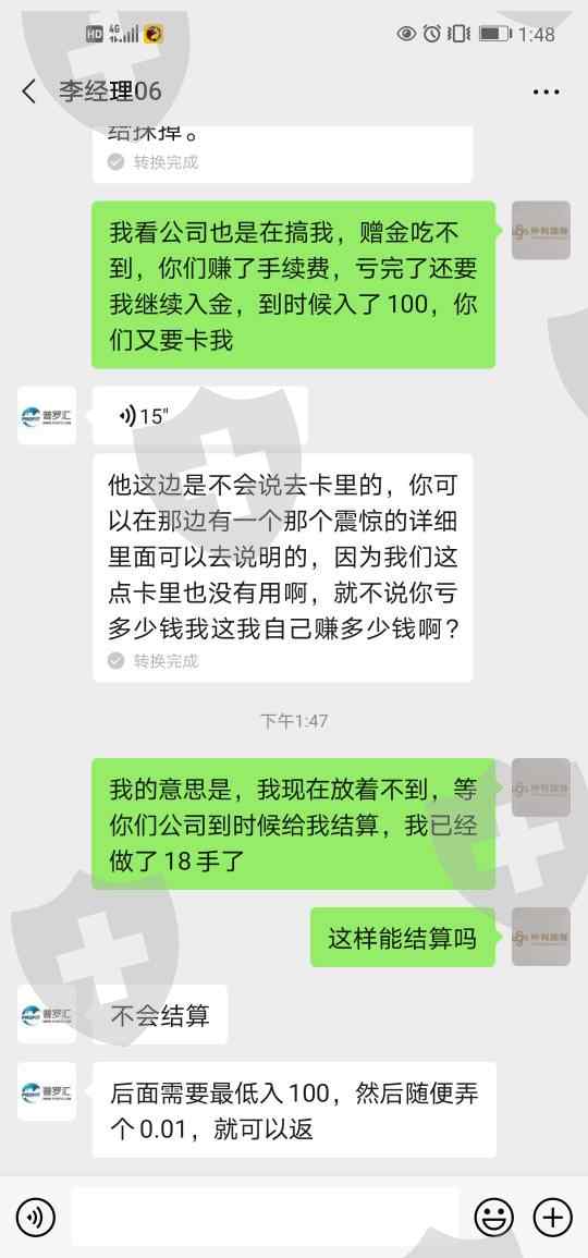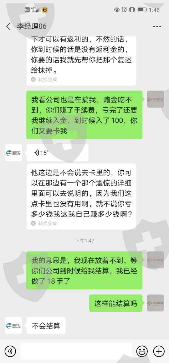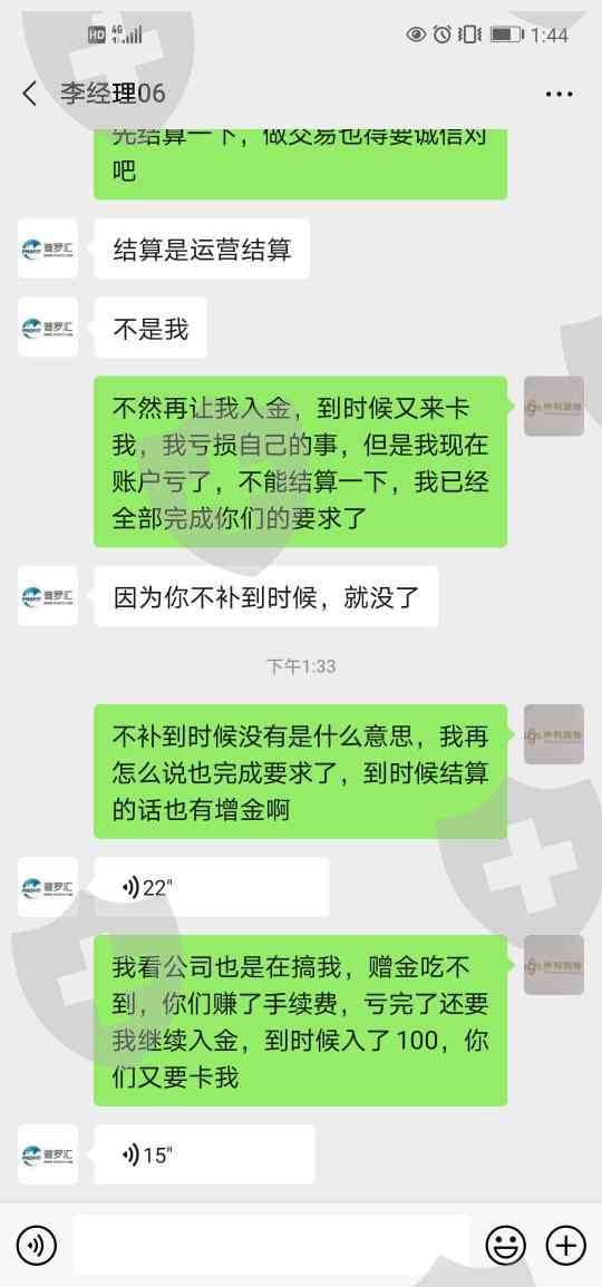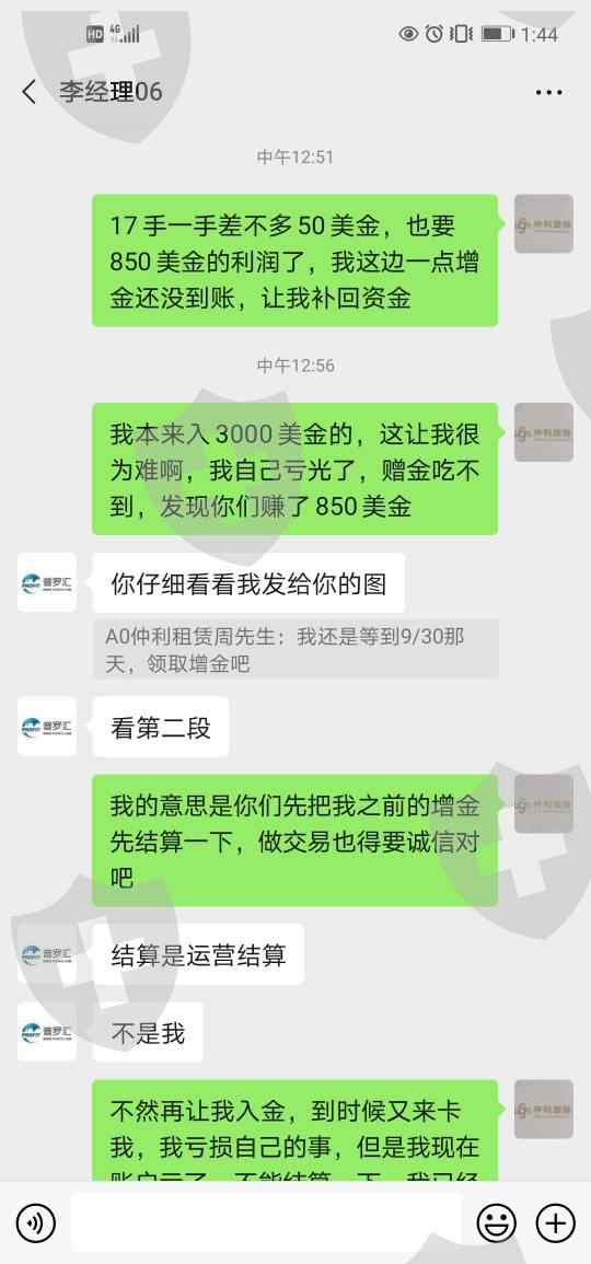普罗汇以入金赠金,平仓反赠金的形式诱导客户入金。入了500美金后,赠金100说做10手到账,然后说没做一笔交易都有赠金,本人做了18手亏完也没领到赠金,和交易赠金,联系经理一会儿让我再入100再做。我说那我放着不做,等你们活动结束,总该结算我赠金了吧,你看看也不行,之前做的交易没有任何赠金,这不是骗子是什么,点差也巨高,平台稳定性又差,常常登不上。谨以上举报,告知各位交易者!