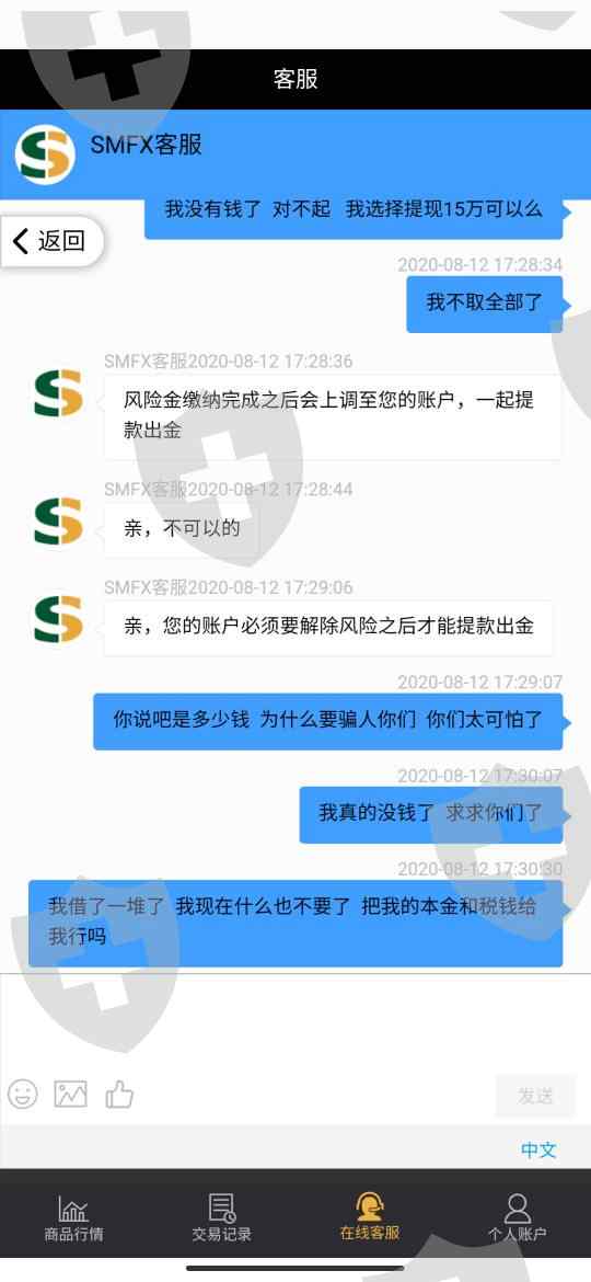 骗子发了一个SMFX的二维码,根据二维码操作下载后,诱导我入金10000,程序员才能接单,然后跟着所谓的程序员一起下单,然后又让我们入金补仓,三轮结束后,说的可以提现,但是出金要交税,交完税要交风险解除金额,才知道自己被骗了,一共被骗了68045元,心情简直难以言喻,现在已经不知道怎么办好了