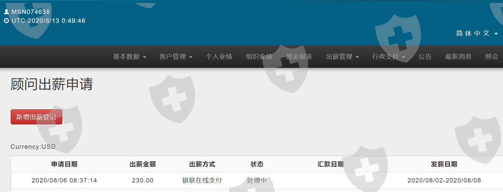 大家都当心了,我就出金区区230美金,拖延到现在一个星期都没有给处理,都想想自己账户里资金是否安全,不相信大家现在提交出金试试看。有图有真相,大家可以看截图。现在时间是2020年8月13日,提交日期2020年8月6日。