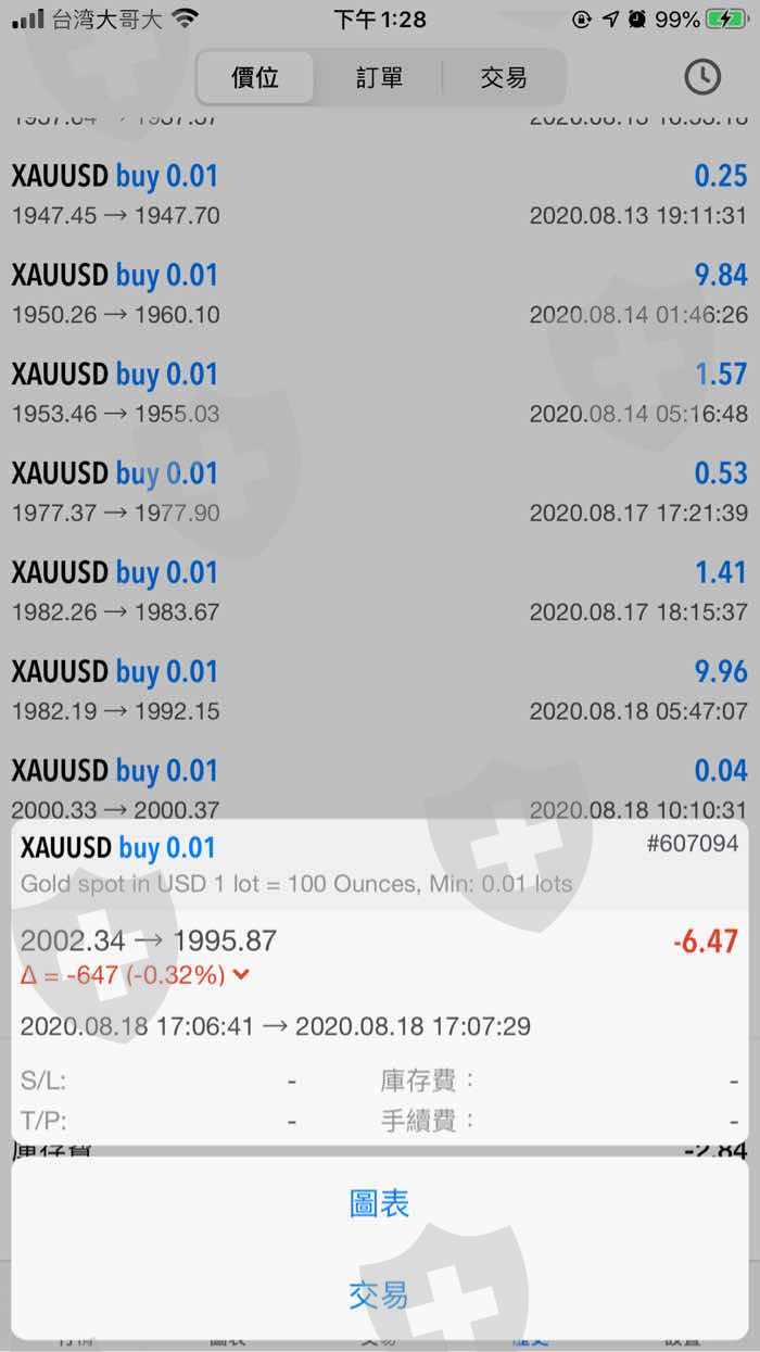 個人是手機板MT5下單,大約在黃金2010上下浮動時(2020.08.18晚上),下即時單0.01手買多,但是卻顯示買到2002.34的單。
