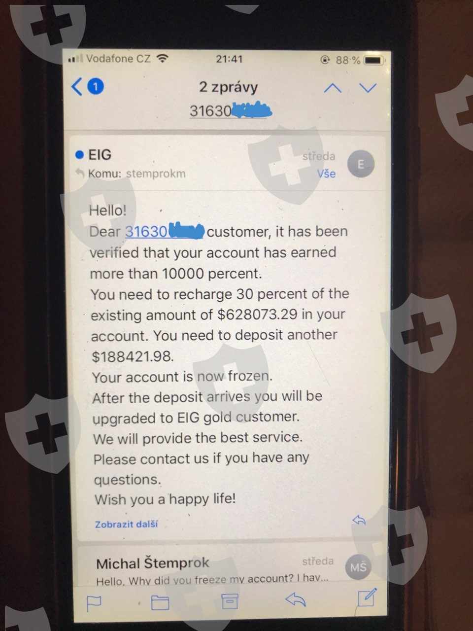Write me support:Hello!Dear 31630xxxx customer, it has been verified that your account has earned more than 10000 percent.You need to recharge 30 percent of the existing amount of $628073.29 in your account. You need to deposit another $188421.98.Your account is now frozen.After the deposit arrives you will be upgraded to EIG gold customer.We will provide the best service.Please contact us if you have any questions.Wish you a happy life!-----------I'm writing to support:Hello,Why did you freeze my account? I have provided you with every document you wanted and there are more than $ 775,000 in my account.Nowhere is it stated that 30% would have to be paid before withdrawal.It looks like a big scam.I trade on many exchanges, including Binance, but I have not experienced such behavior anywhere.So let me know 1) Why did you freeze my account? 2) Why do I have to send 30% of my balance?Because I dont unerstand it. What should I do? Pleas help me!