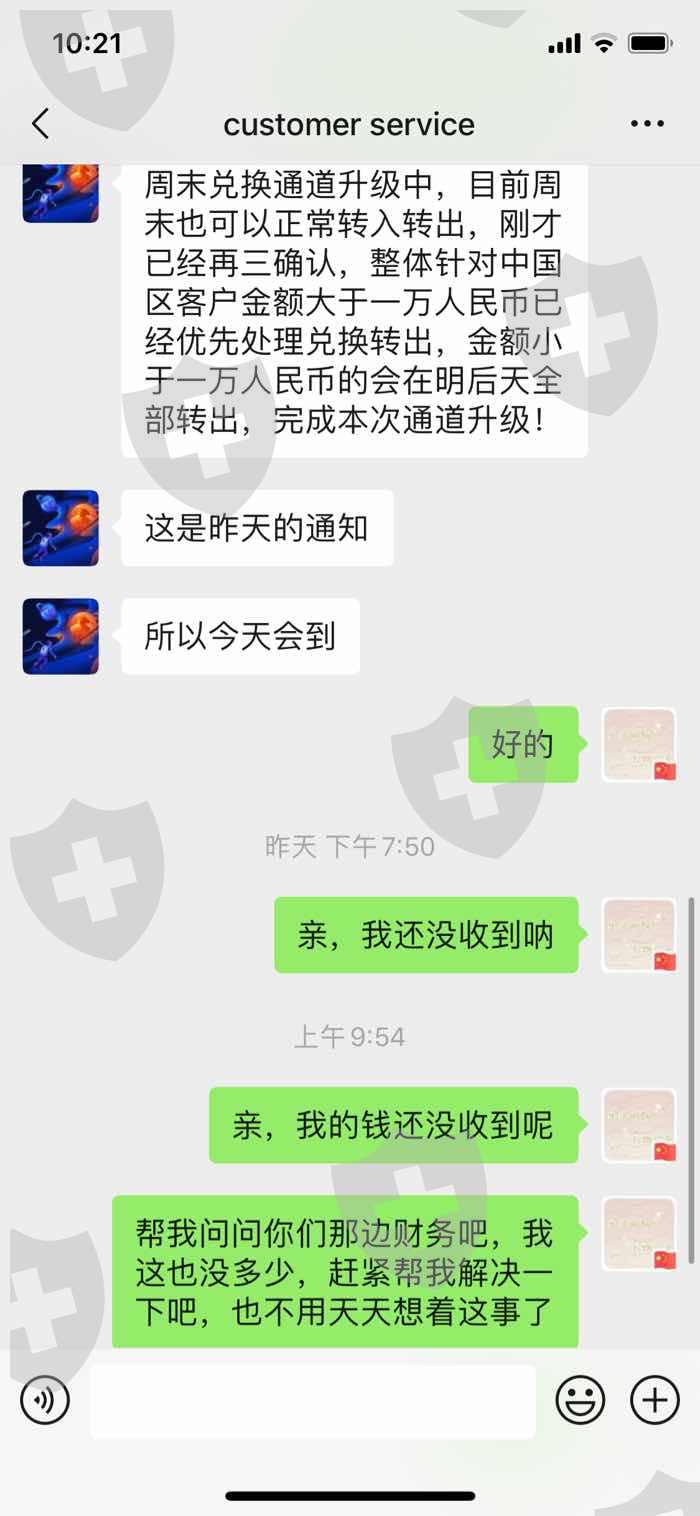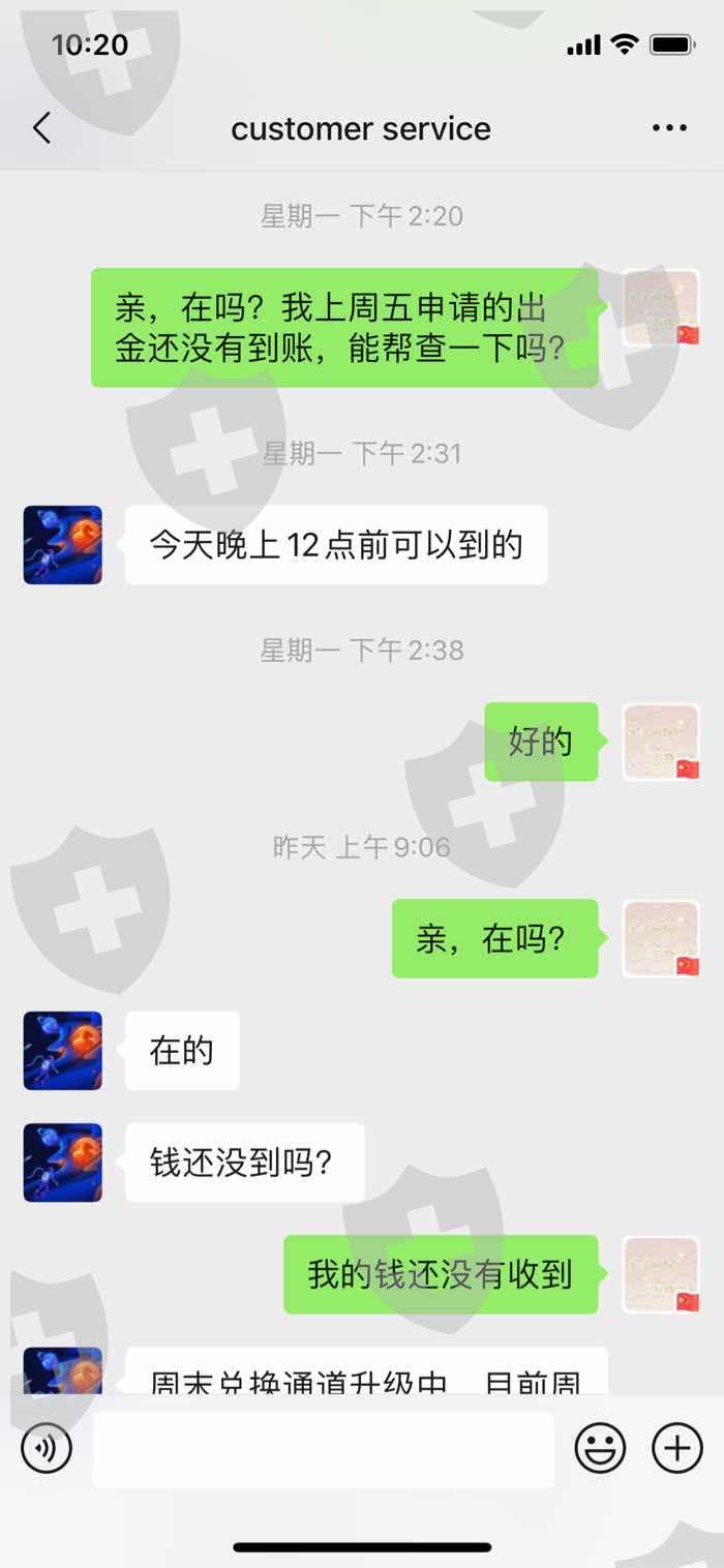 周五申请出金,周一时账户出金记录显示已出金并打款,但是迟迟未收到钱,询问客服,客服以通道升级为由推脱,今天客服已经没有任何回复
