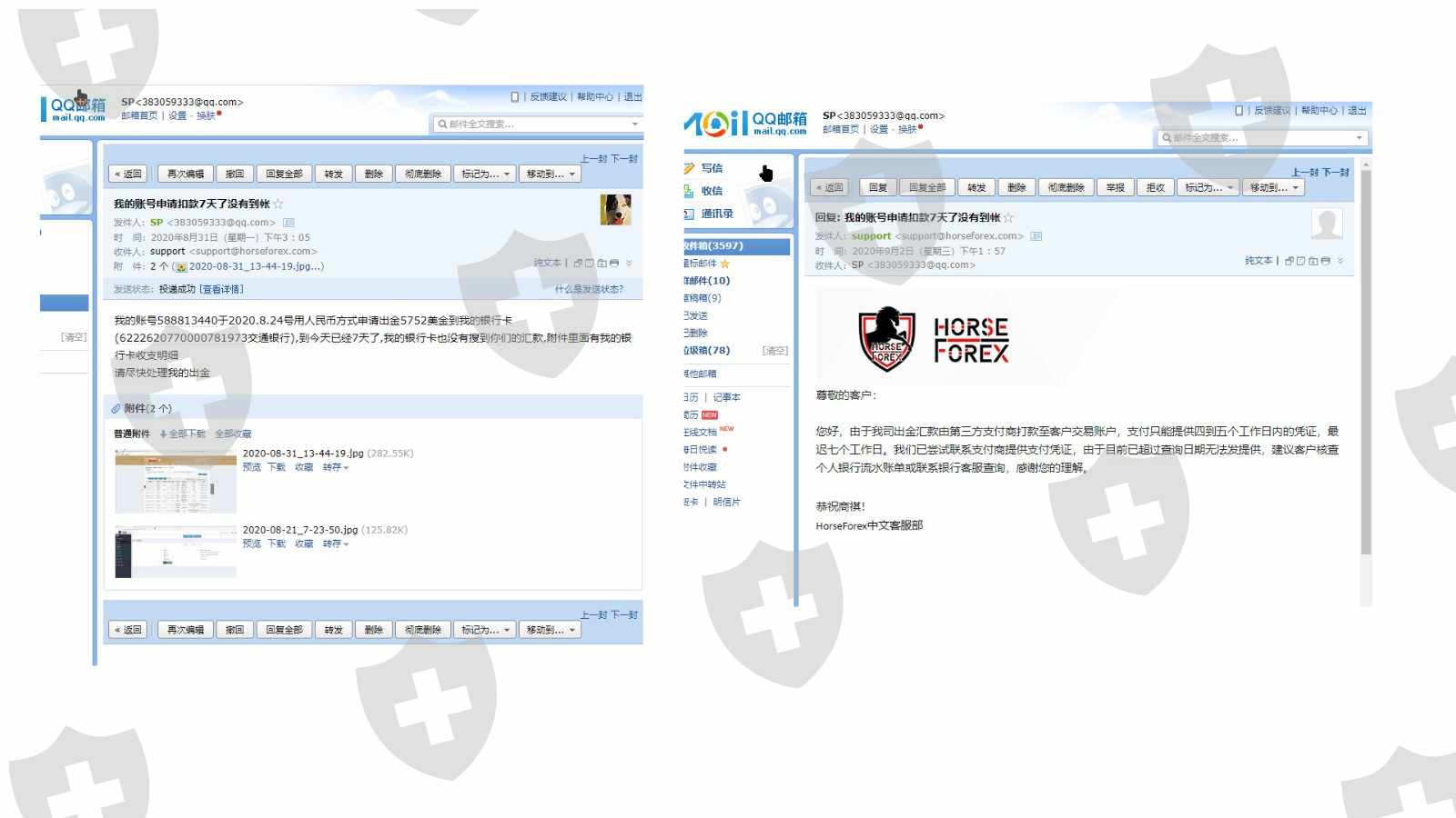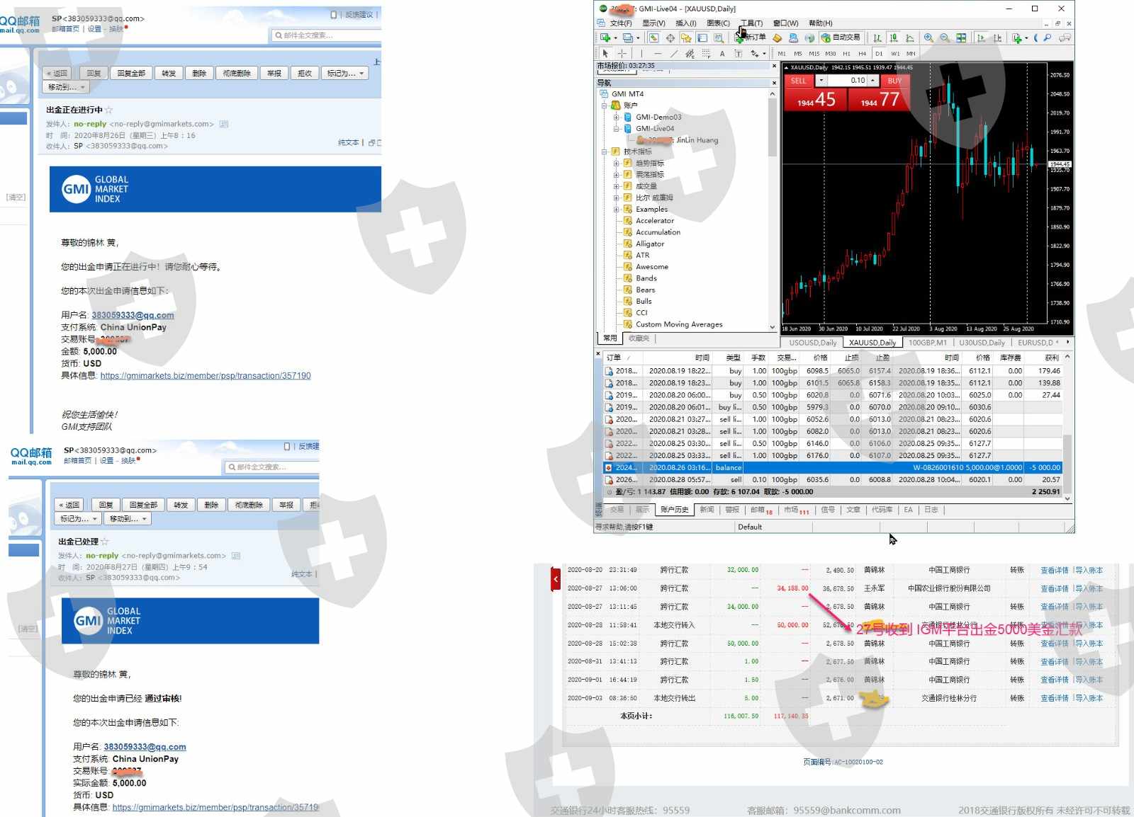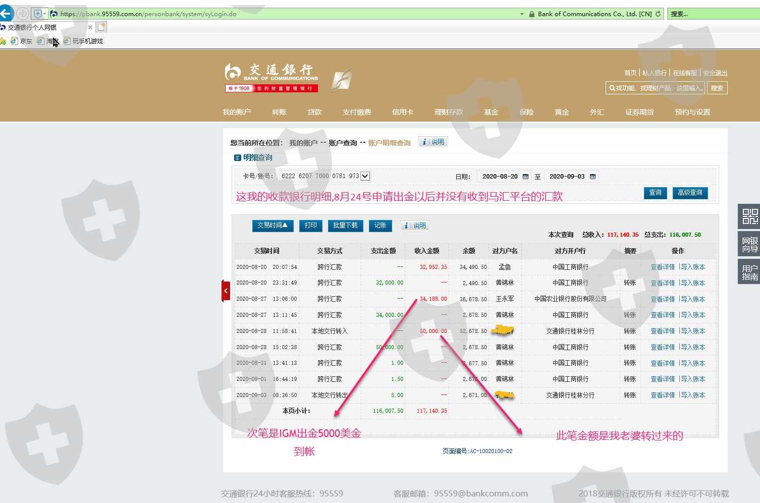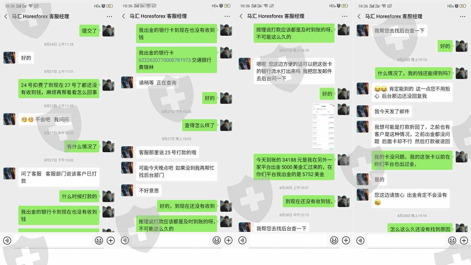 我的账号588813440在马汇7月8号入金285美金,8月10号入金5022美金,到8月24号盈利了500美金左右申请全部出金5752美金(折合人民币39188元)准备入股市,8月24号当天就从账号扣款了,但到27号还没有到帐,我就问客服经理,并发了我的银行流水给他,客服经理说25号就已经给我打款了叫我晚点看看如果还不到账就问后台客服,.28号还没有到帐于是我就向后台客服反映并上传了我的银行流水, 31号后台客服说已经打款叫我提供流水,但我的银行卡还是没有收到钱,我又提供了最新的银行流水,并要求客服提供他们的转账凭据,之后到现在后台客服再也没有回音了. 当天我又问客服经理,客服经理叫我发邮件给客户邮箱并上传银行流水,我就发流水到客服邮箱反映问题了,从此之后客服经理也失踪无回音了. 直到3天后9月2号才收到邮件,说查询期限为7个工作日,已经超过查询期限,查不到他们打款凭据了,叫我查自己了流水,但到今天9月3号我还没有收到钱.按理从8月24号到9月2号收到邮件当天不算周末也才7个工作日呀,怎么就超过7个工作日了呢? 我想知道为什么他们27号不查他们的支付凭据,28号呢,31号呢为什么不查支付凭据?看来是根本就没有给我打款想耍赖 下面有我跟他们的聊天记录和我的收款银行卡明细
