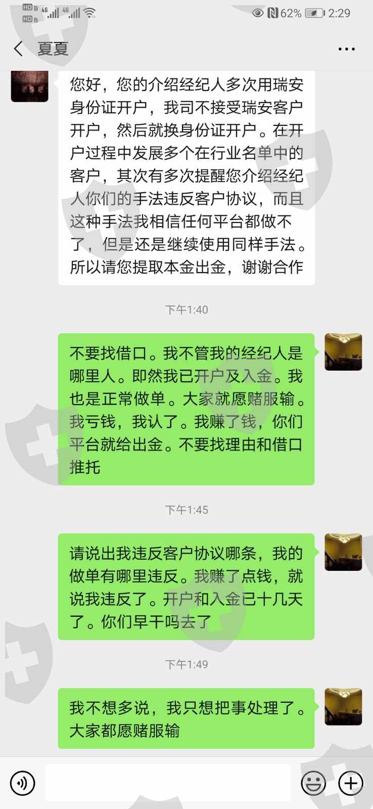 我是8.13开户并入金。前两天说不能出金。并关闭我的账户。我问他们关闭账户在理由。给我的回复模棱两可(祥见聊天记录)。我只希望平台给我不出金的理由。