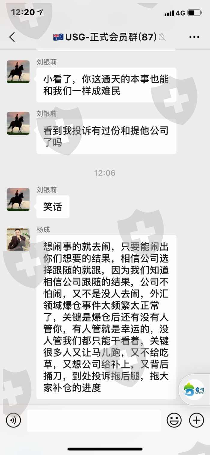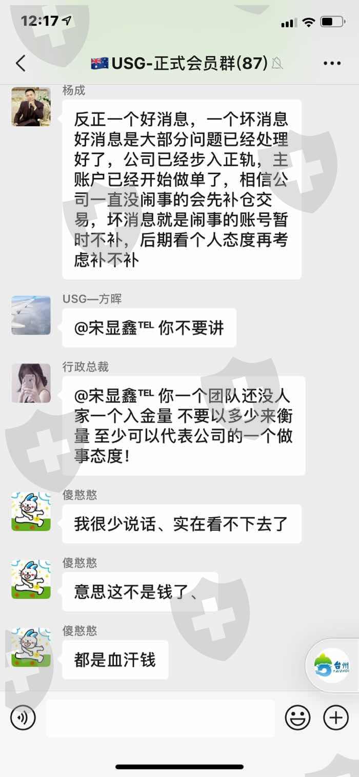 这是一个有组织有预谋的欺诈行为。公司宣传一个亿实缴的保障金担保。入金澳大利亚USG联准平台。由操盘手王建农操盘,宣传操盘手是美国回来的,年薪7000万。并且前五年一直在一家基金公司操盘。18年没有爆过仓。一月收益15%~30的的回报吸引投资,但实际情况都是虚假。我们会员发现公司虚假宣传要求出金。公司强制不让出金。然后在3月2号集体爆仓。造成大部分会员全部投资款亏损一分不剩的事实。给广大会员造成几千万的亏损,给社会造成了及不安定的环境隐患。