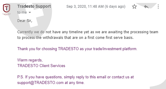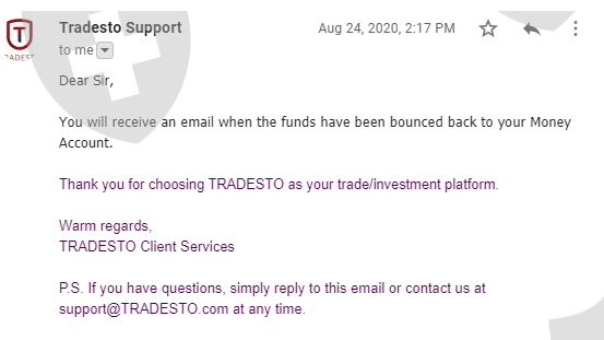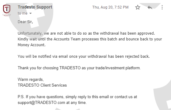 Although I have asked to cancel a withdrawal due to wrong bank info, Tradesto takes an extremely long duration to process withdrawals and without our notice they reduced the withdrawal exchange rate without notifying the users at all and worst of all, it's been 4 weeks and I still have not receive the amount being bounced back to my Tradesto money account because to withdraw your money there is a "first come first serve" basis? while waiting over 4 weeks? Many of my friends that are using other brokers do not have such policy for their withdrawal. This is extremely frustrating.