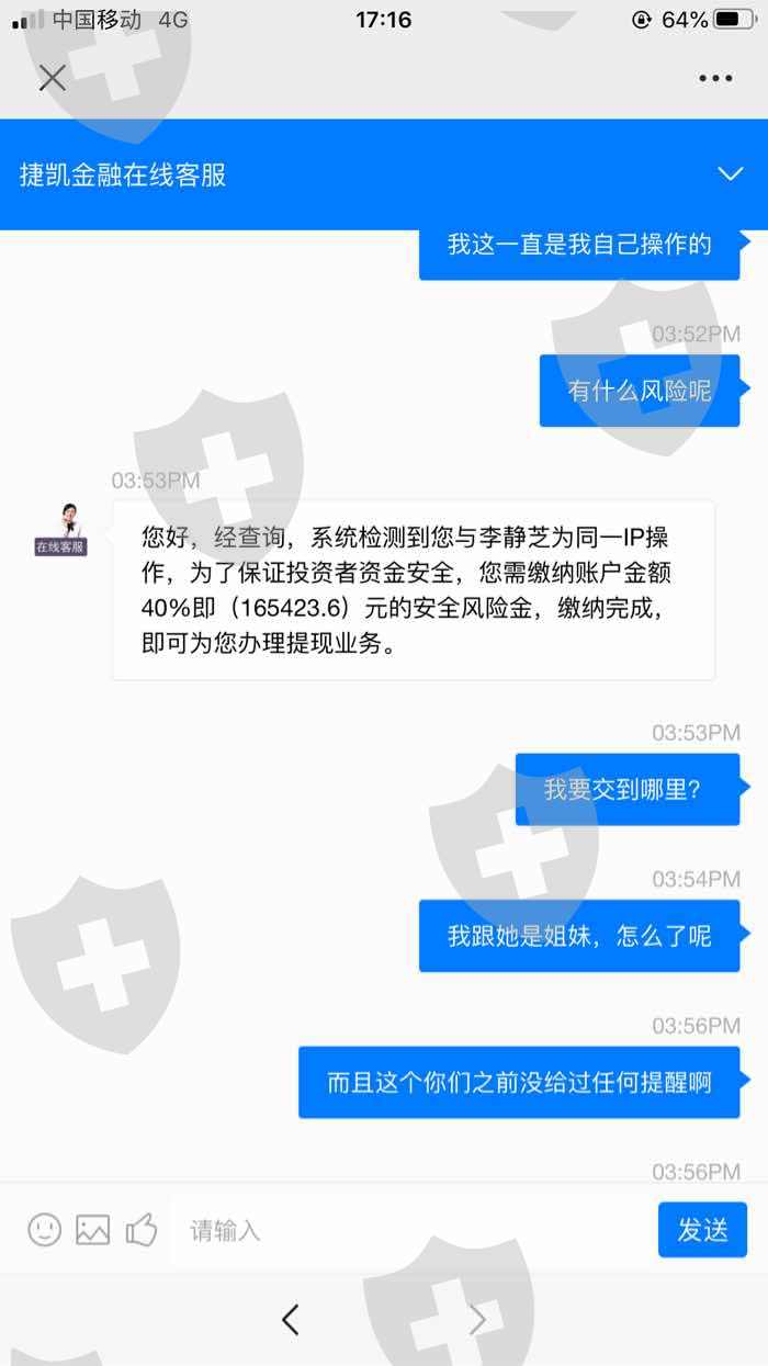 捷凯金融,在用户缴纳60万本金的情况下,要求用户缴纳账户总金额的40%安全风险金才能出金,威胁客户说不交风险金每天扣除10%保管费,还要送征信机构,如此恬不知耻,骗去客户血汗钱,人神共愤。