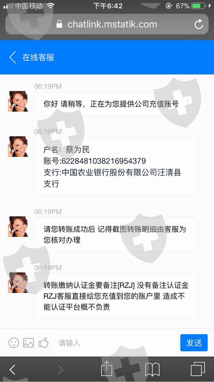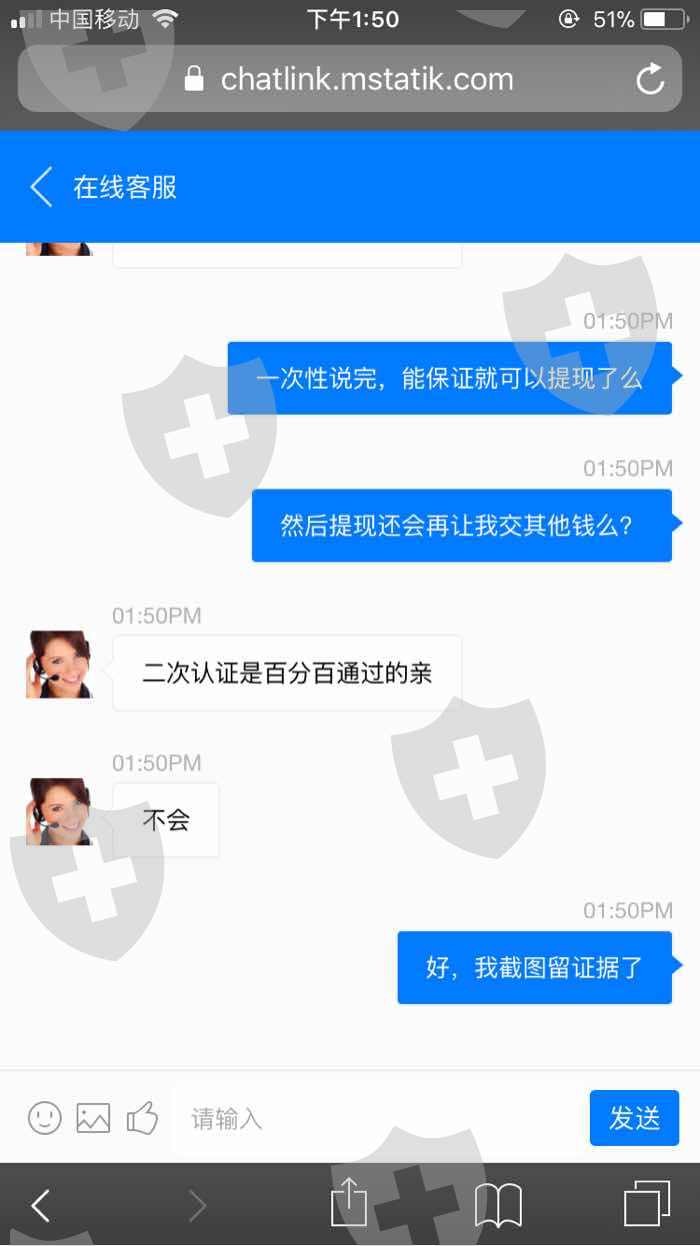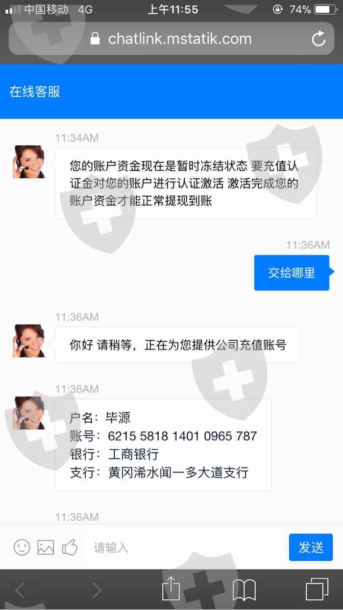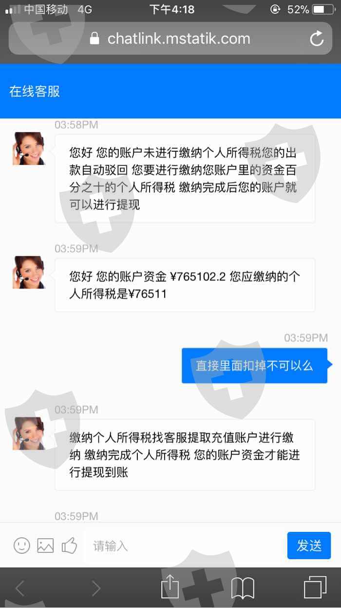 8.21日看到朋友圈带单业务员发的破解了系统漏洞,百分百盈利,跟着入金8万操作,盈利后账面显示金额76万多一点,然后需要缴纳10%个税才给提现,缴纳后说我银行卡号输错一位,需要缴纳认证金也是10%,缴纳后说认证未完成,需二次缴纳,负责账户给我永久冻结。其实就是黑平台故意更改银行卡号让交认证金,杀猪盘。请求平台出面本金退回就好