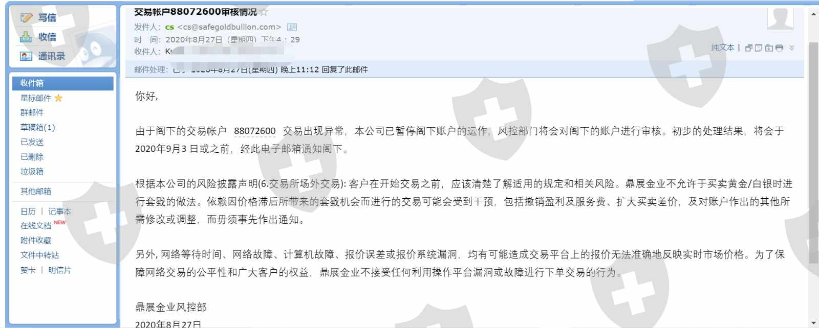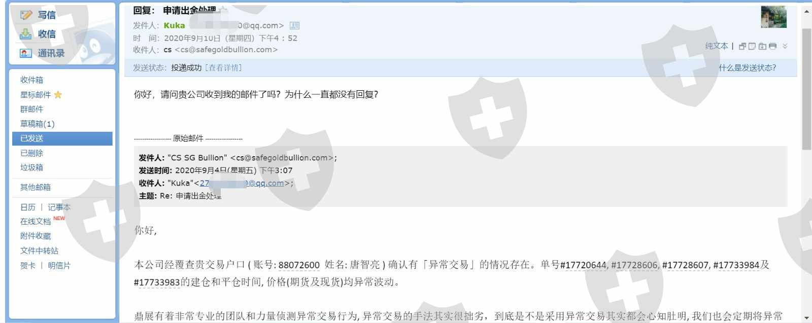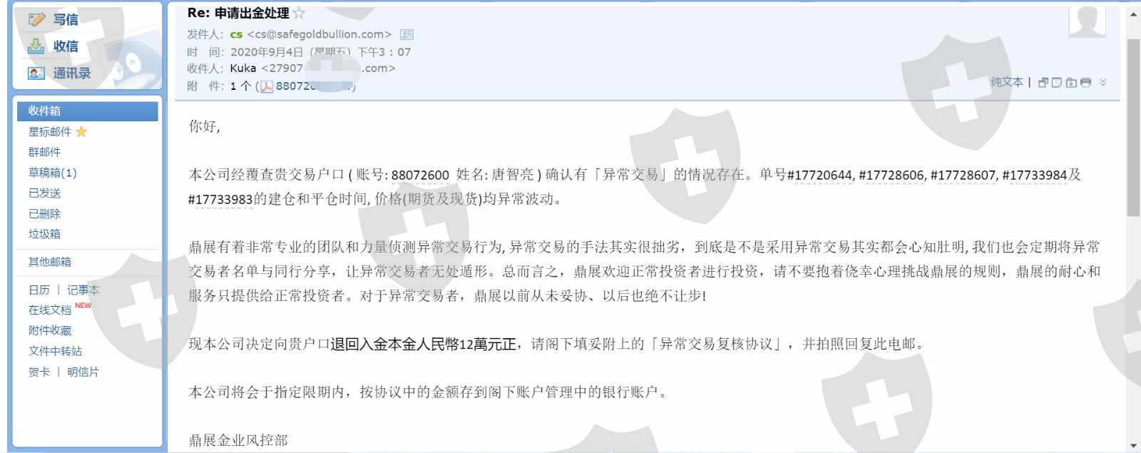 本人唐智亮,账号88072600,于2020年8月10号15: 59: 36向鼎展金业名下黄潮杰入金12万元整(有银行回执及鼎展金业后台截图为证) ,到账17167. 62美金,从8月13号开始交易,总共交易50手,盈利17550美金,于2020年8月18号提交出金15000美金,但是一直没有到账,后来我要求本金加盈利全额出金,贵公司更是把我的提款选项给关闭了,并且该公司风控部门通知说我的交易账户出现异常,只给出本金不给出盈利,我立即翻阅了我的交易记录和该公司的异常交易细则,确定并无任何违反该公司异常交易细则的行为,我不禁想要问该公司,难道该公司只允许客户亏损不允许客户盈利吗?于是我多次发邮件给该公司,但是鼎展金业并不给任何回复,现在距离出金已经一个月了,但是没有收到任何资金