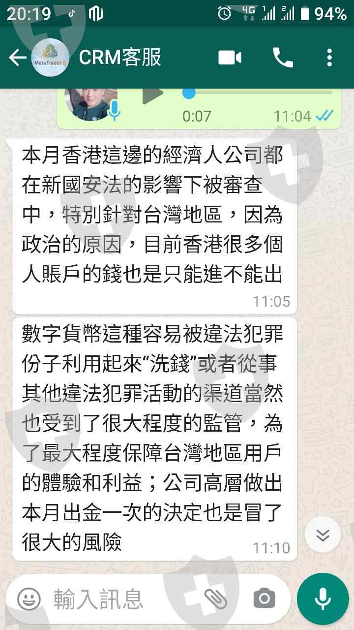 被FB朋友騙上車,一開始想入個1000美金當玩遊戲,結果一直有獲利,8月出了100美金成功,但要提1000美金時就說因為台灣客戶一個月只能出金一次,好吧,等9月1號要提20000美金時,直接說因為香港國安法,直接砍掉台灣客戶的帳號,當然資金也就化為泡影。目前已經跟香港警方報案了,請大家不要再被騙了