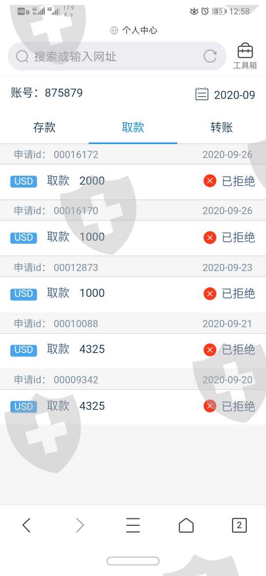 17号和18号充钱的,十万块里面有五万多是借的。然后我20号的时候开始想要体现了,发现提现不了,被拒绝了,而且我21号那天昨天我也提现了,一直到现在还是被拒绝了。问客服一直在拖延时间一会说要交保证金一会说要达到流水金额,目前账号已被取消授权登录不了。23号和28号所谓的老师说买三层仓位多单、谁知道一分钟内跌一千多点直接爆仓,希望大家引以为戒免得上当受骗。